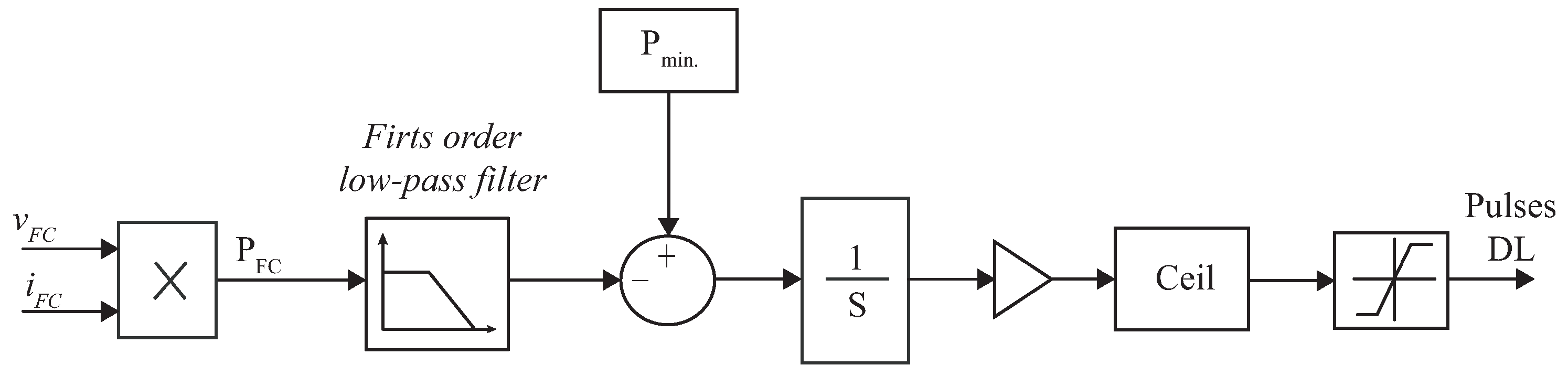 The resulting error feeds a discrete integrator, whose function is to progressively generate a power reference for the DL. The minimum power threshold () is introduced as a fundamental safety margin within the control strategy, as it prevents the fuel cell from operating excessively close to the condition, a region where small disturbances can induce reverse power flows. This threshold allows for early activation of the DL, so that excess active power is dissipated before the fuel cell power becomes negative. Additionally, improves the system’s robustness against practical uncertainties, such as measurement errors, delays introduced by power signal filtering, and inherent system dynamics. Without this threshold, the controller would only react when the power is already negative, an undesirable condition for electrochemical devices like fuel cells, due to the potential adverse effects on their performance and lifespan.