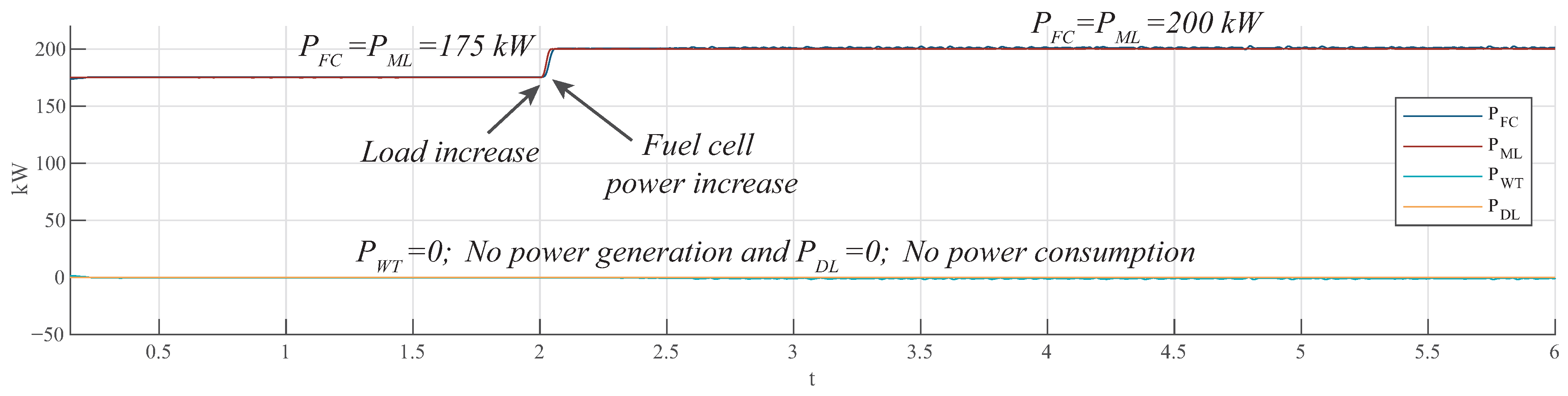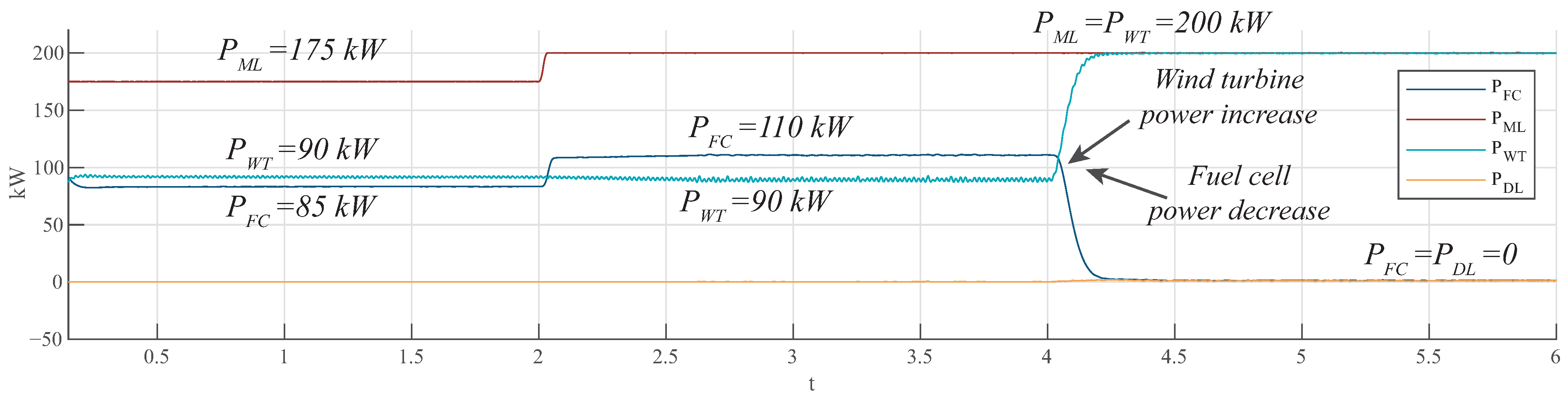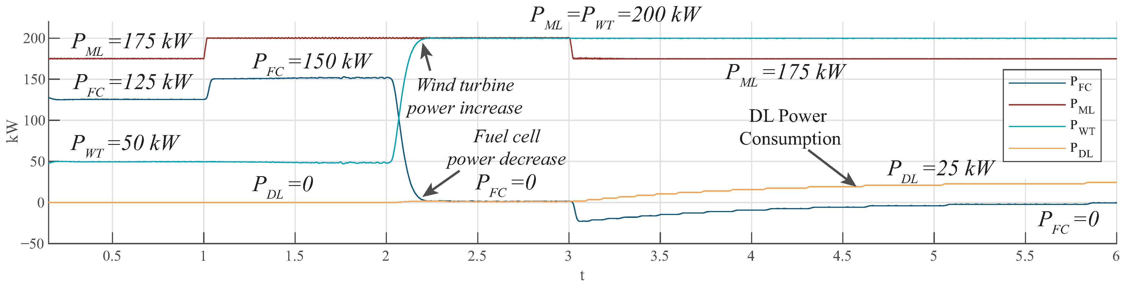 Subsequently, between and , the main load experiences an increase in demand, rising from 175 kW to 200 kW. Since the power generated by the wind turbine remains constant at 90 kW, the fuel cell increases its output to approximately 110 kW to compensate for the increased load and ensure the full supply of active power. Again, no activation of the DL is observed.