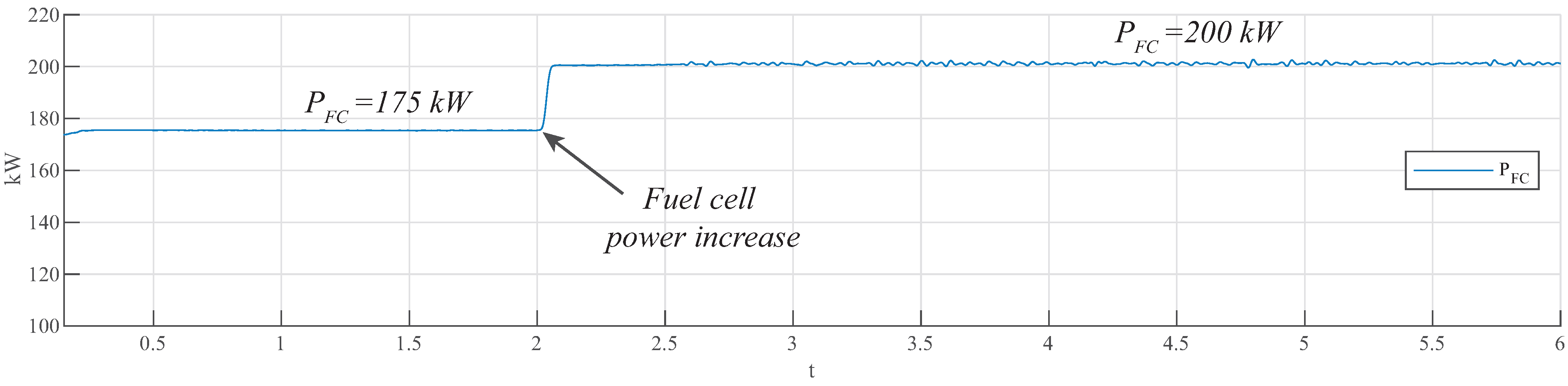 Therefore, the complete fuel cell system corresponds to 60 identical stacks (), producing a DC bus and approximately , which results in the power level used in the simulation study. This modular scaling approach is consistent with practical fuel cell installations, where multiple low-voltage stacks are combined in series and parallel to reach higher voltage and power levels while maintaining manageable electrical ratings.