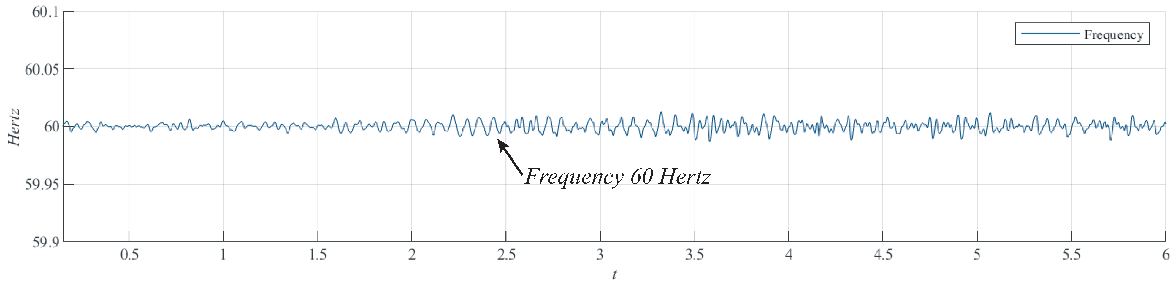 Figure 18 shows that the system frequency remains close to the nominal 60 Hz, exhibiting only small transient oscillations associated with power variations, but without compromising the overall stability of the system. These oscillations remain within acceptable limits and demonstrate an adequate dynamic response of the frequency control.