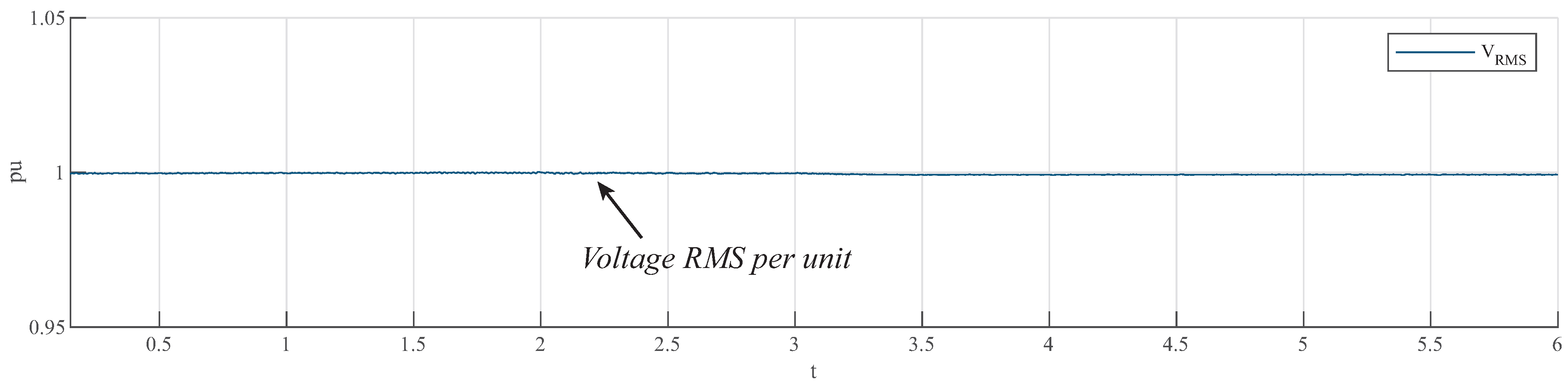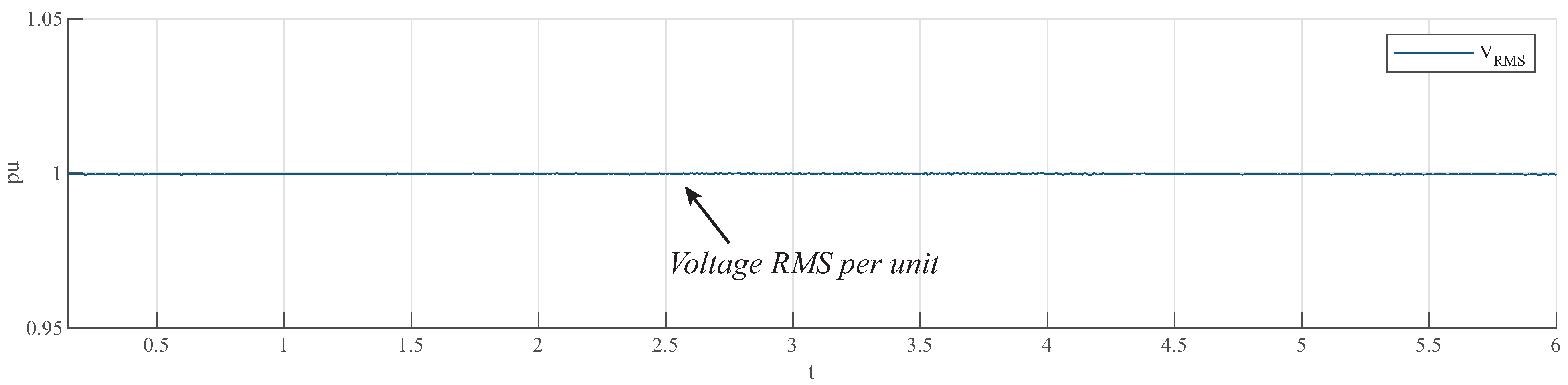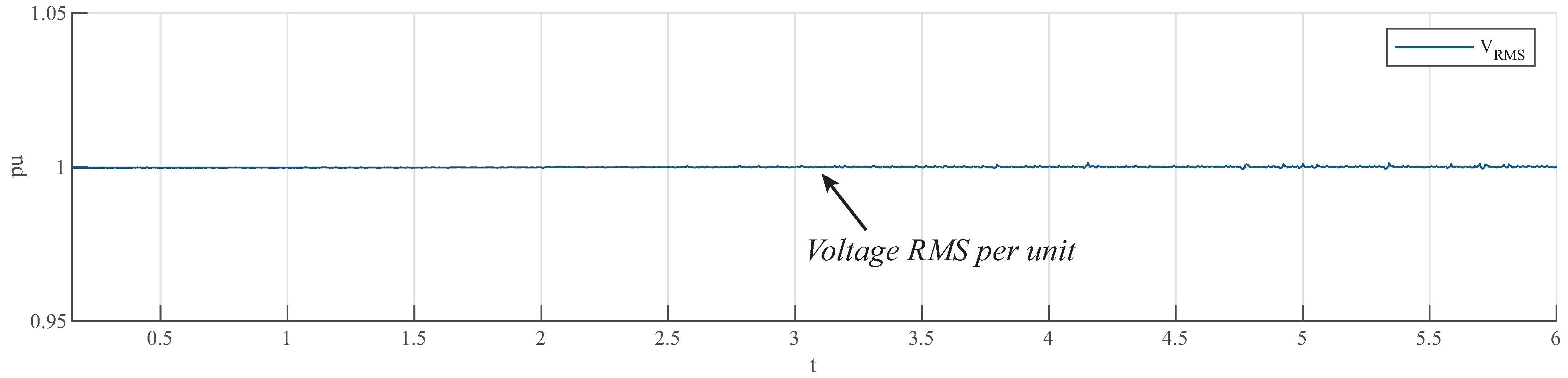 Figure 16 shows that the RMS voltage remains close to 1 pu at all times, without significant deviations. This confirms that the GFM control implemented in the fuel cell is capable of establishing and maintaining the system voltage level appropriately.