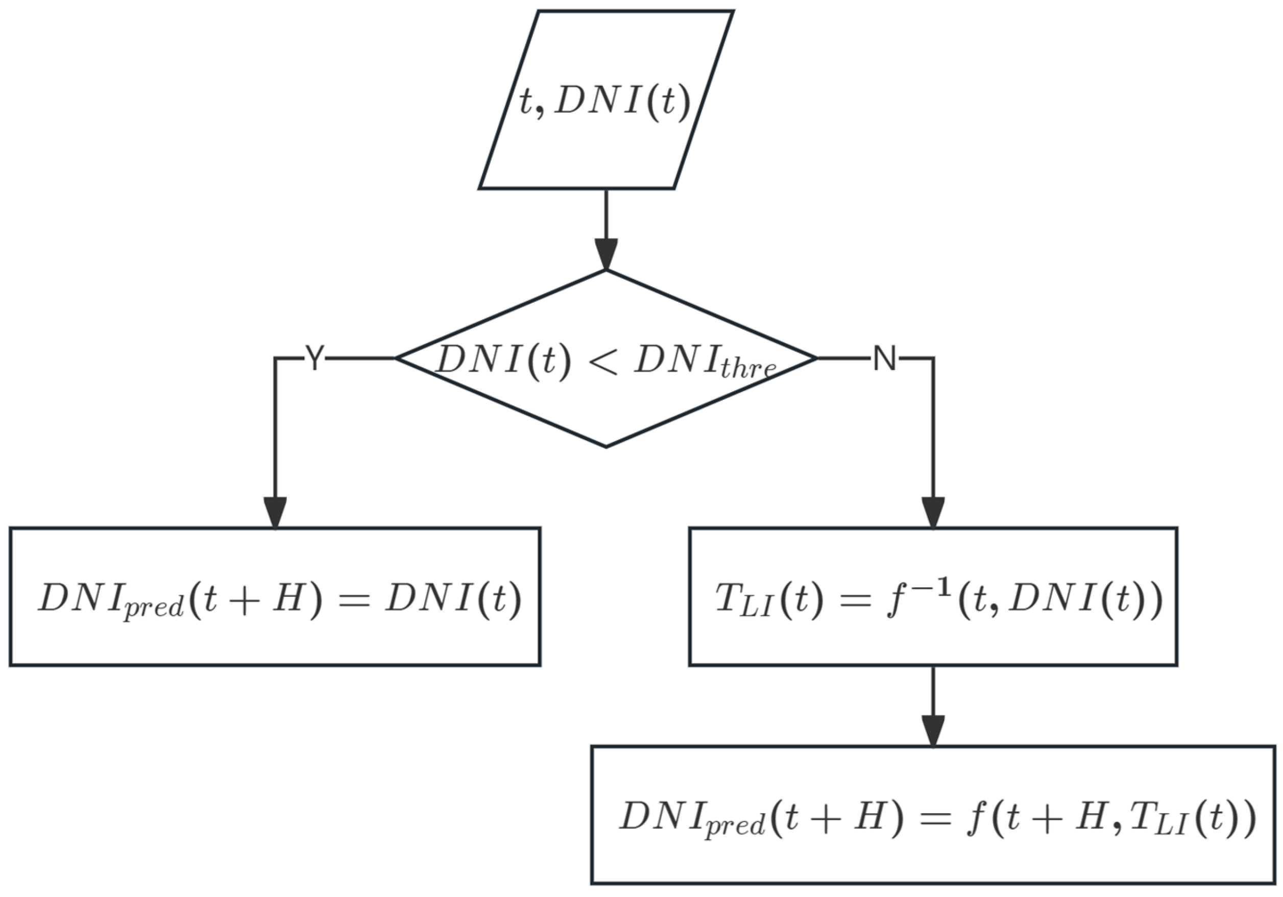 - The predicted DNI, , is computed by applying the function at using the derived , expressed as .