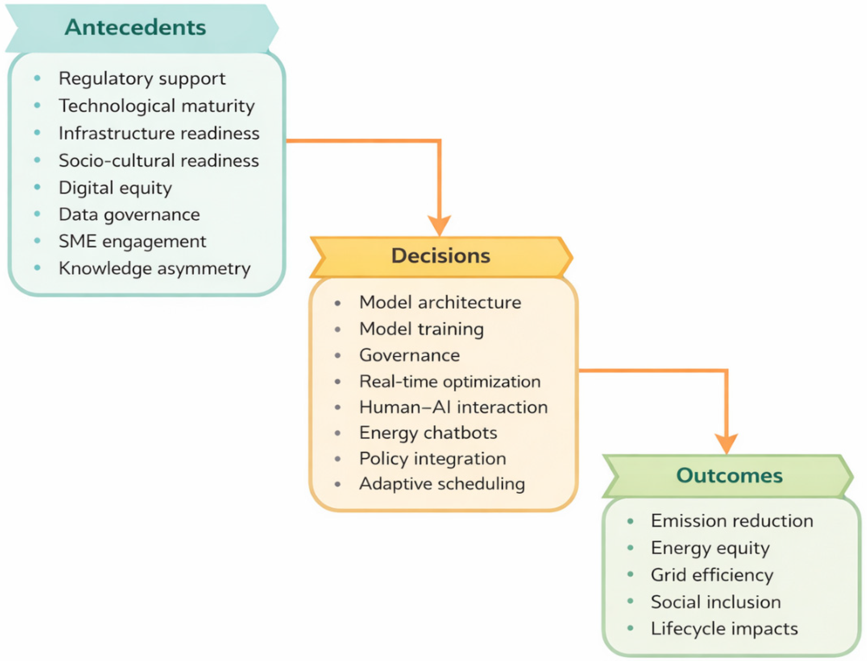 | Decisions | Model architecture, model training, governance, real-time optimization, human–AI, energy chatbot, policy, adaptive scheduling | ![]() |