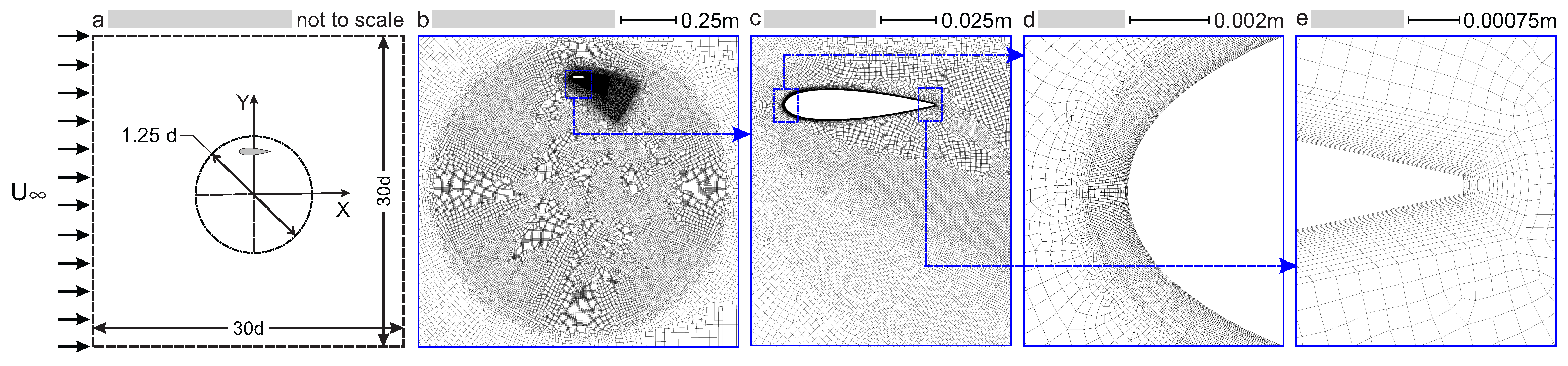 | Grid (Figure 2b–e) | 302,815 quadrilateral cells; 800 cells around the airfoil circumference; max |