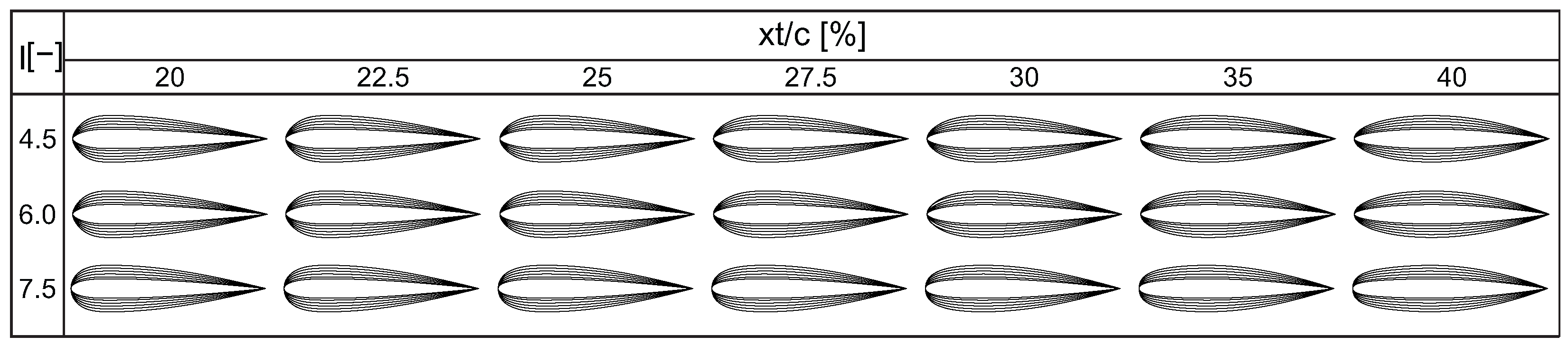 | Chordwise position of maximum thickness [%] | |