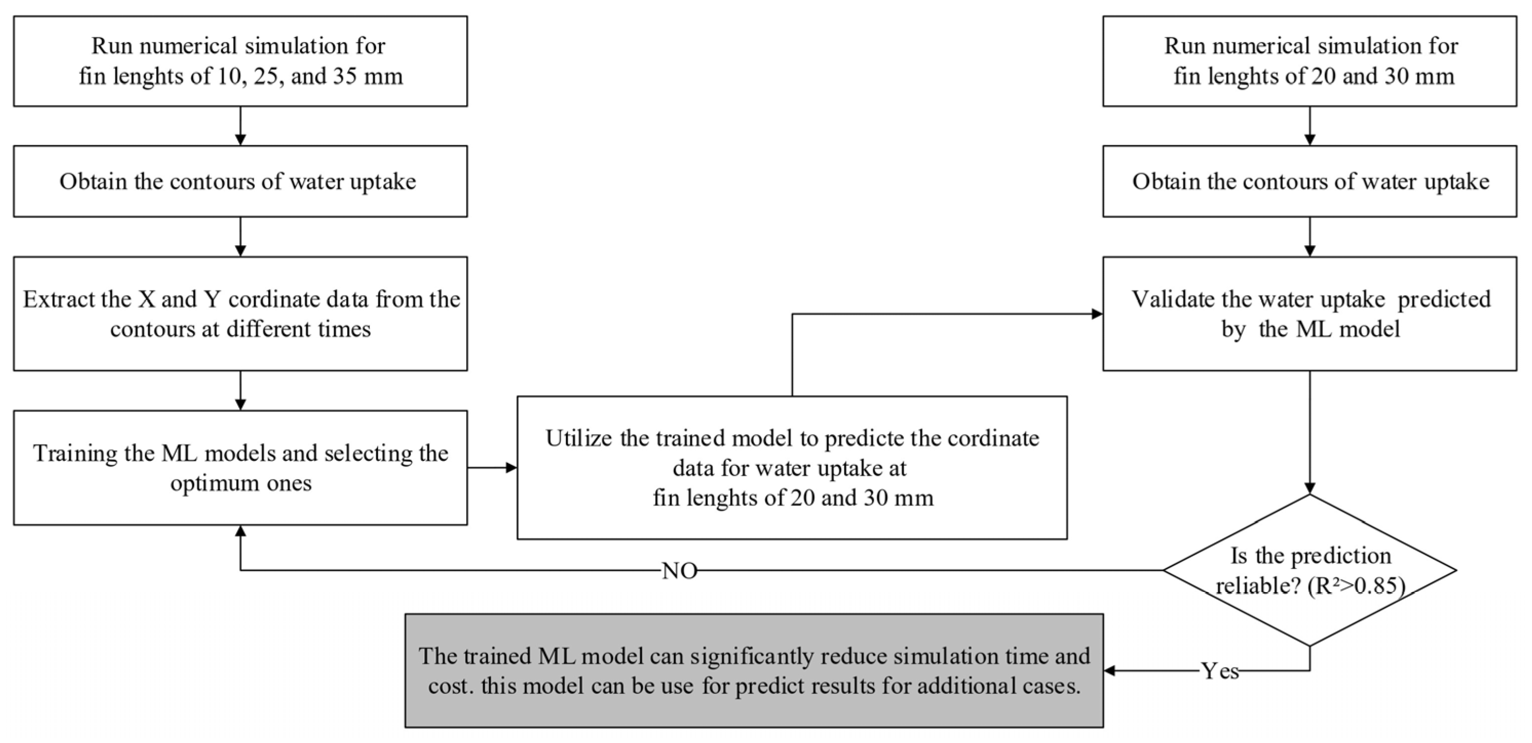 - The trained MLP model successfully predicted water uptake for unseen fin geometries (20 mm and 30 mm) with good agreement compared to numerical simulations.