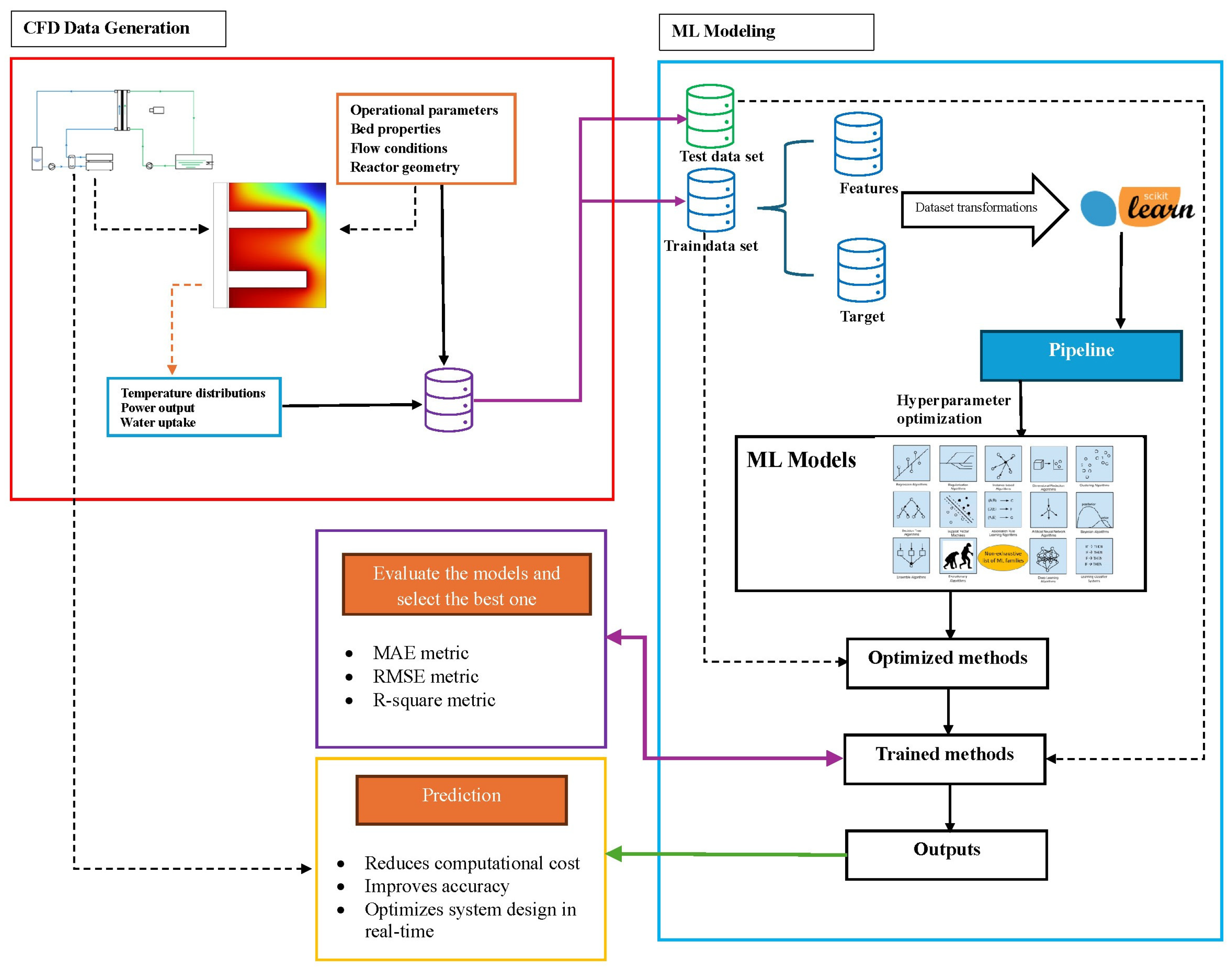 - The machine learning approach significantly reduces computational time, producing predictions in seconds compared with approximately 30 min required for CFD simulations.