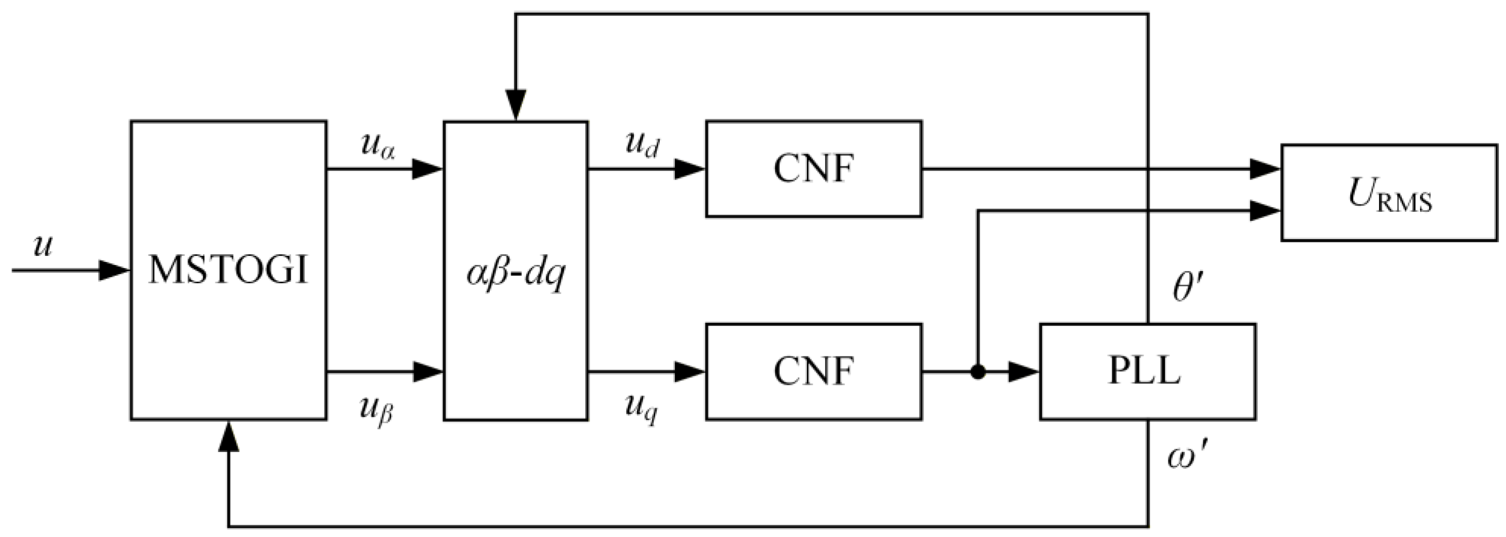 - The filtered voltage signal is input into the MSTOGI-CNF-PLL module to obtain the final output instantaneous RMS value URMS.