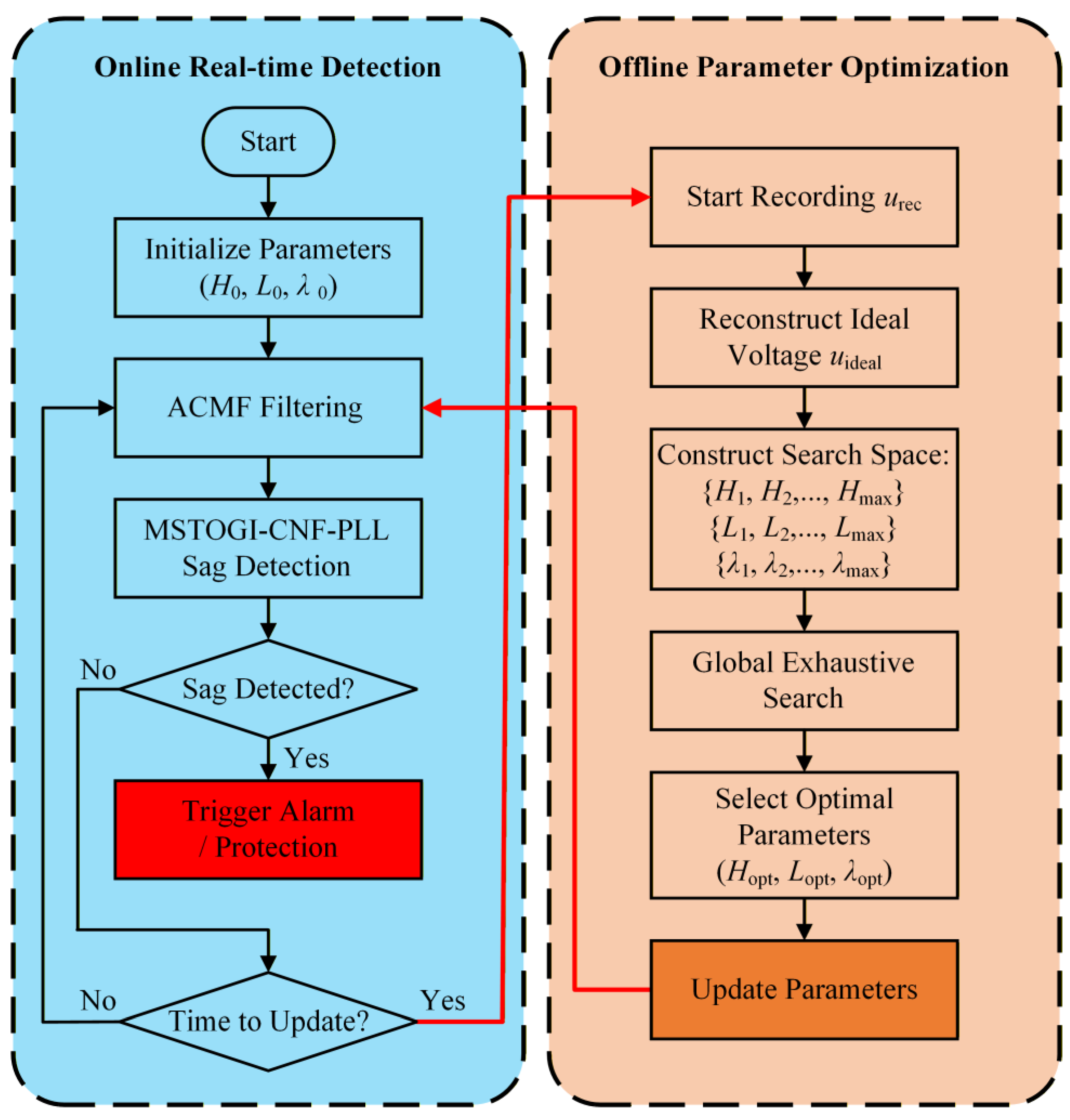 - Upon system startup, the default or previous cycle’s parameters (H0, L0, λ0) are loaded. The ACMF module utilizes these parameters to filter the real-time acquired voltage signal containing disturbances.
