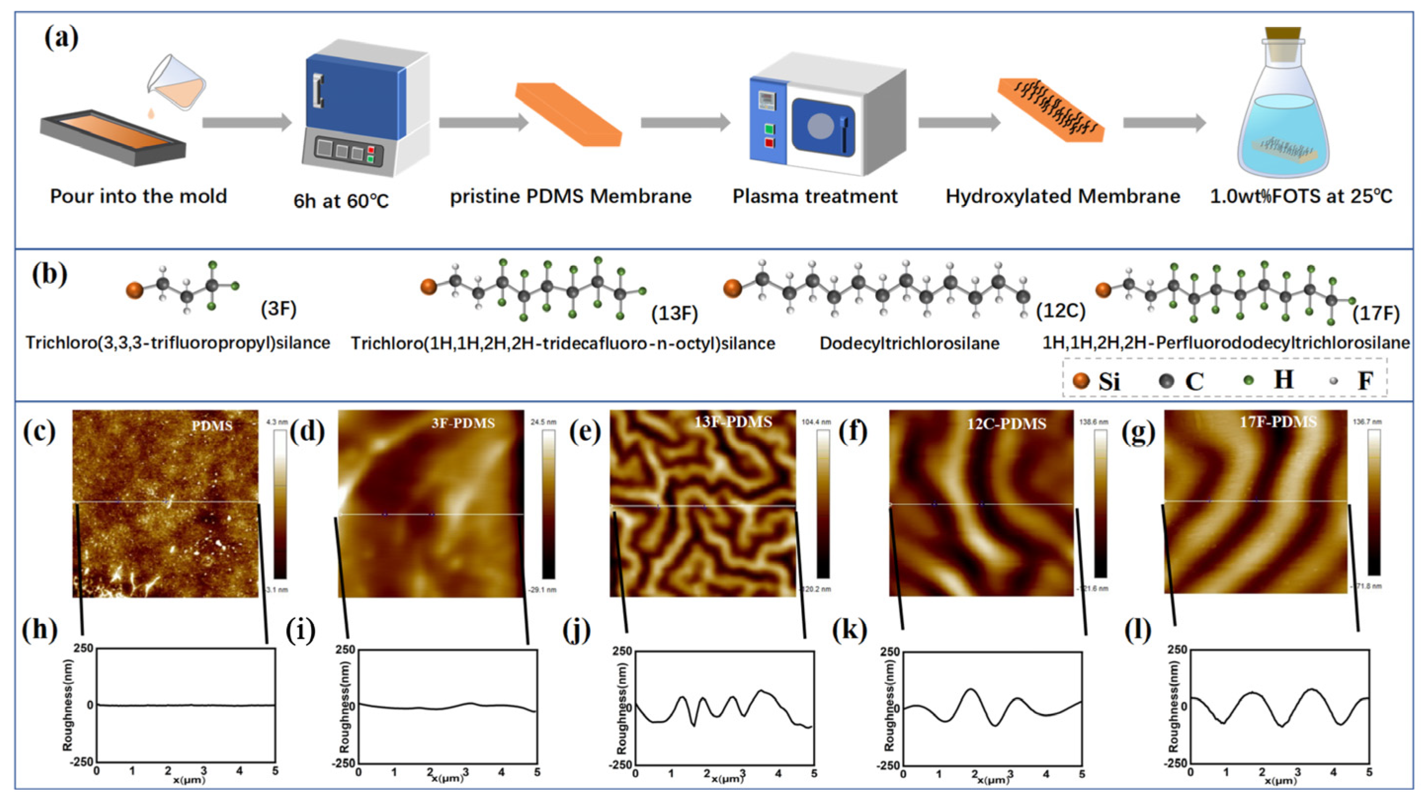 Figure 1h–l shows schematic illustrations of the surface roughness profiles for the five PDMS samples. The surface of the non-fluorinated PDMS film was relatively smooth with low roughness. In contrast, the PDMS film modified with molecular chains via self-assembly exhibited a micro-nano structure with distinct wrinkles, while maintaining overall uniformity.