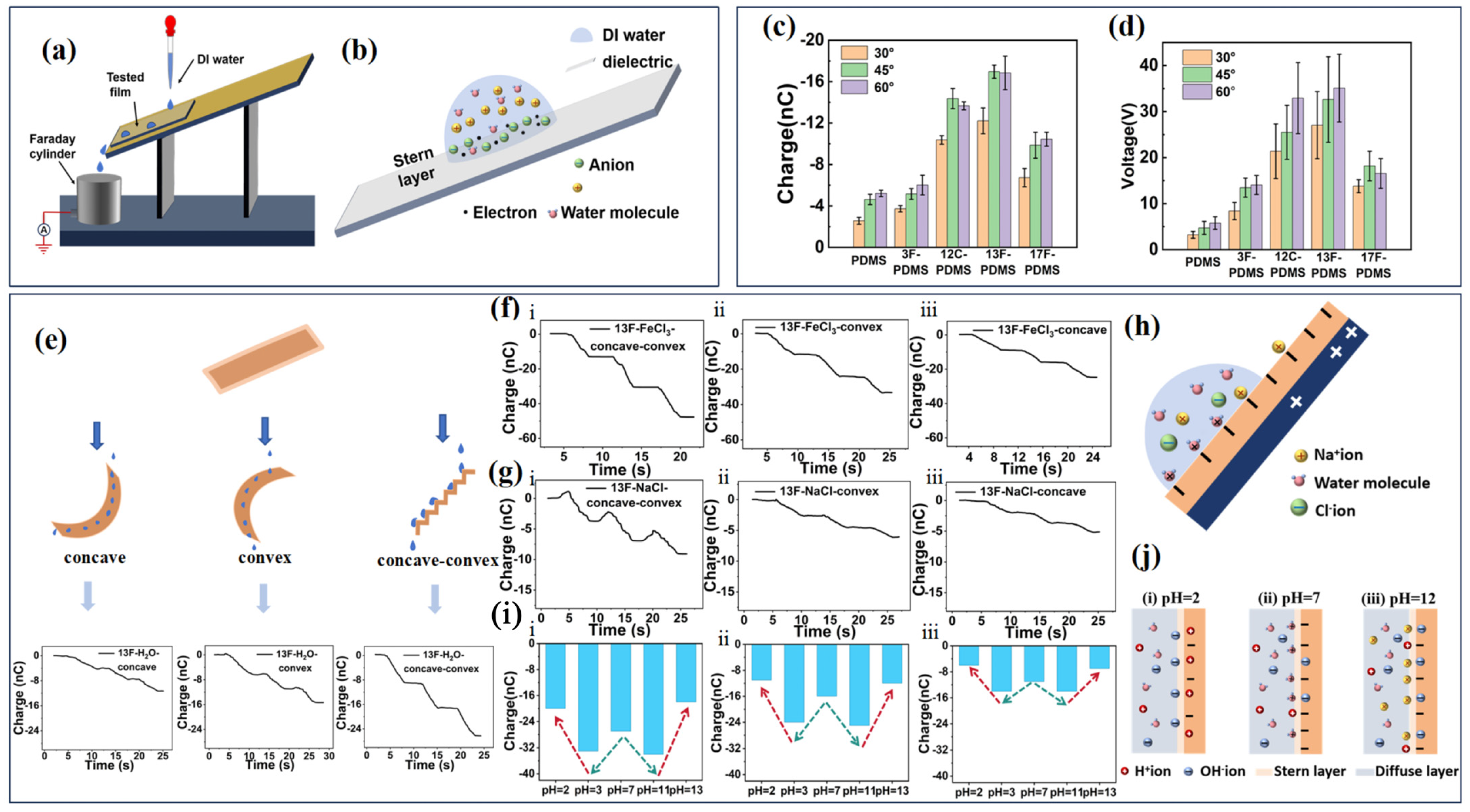 31]. The test PDMS film (20 mm × 50 mm) was fixed onto a plate with adjustable inclination. A rubber-bulb dropper was positioned above the film to dispense 2 mL of deionized water per droplet. A Faraday cup was placed directly beneath the film to collect the water after it flowed over the film surface. The triboelectric charge carried by the droplet was measured as it fell into the Faraday cup. According to the electric double layer (EDL) model illustrated in