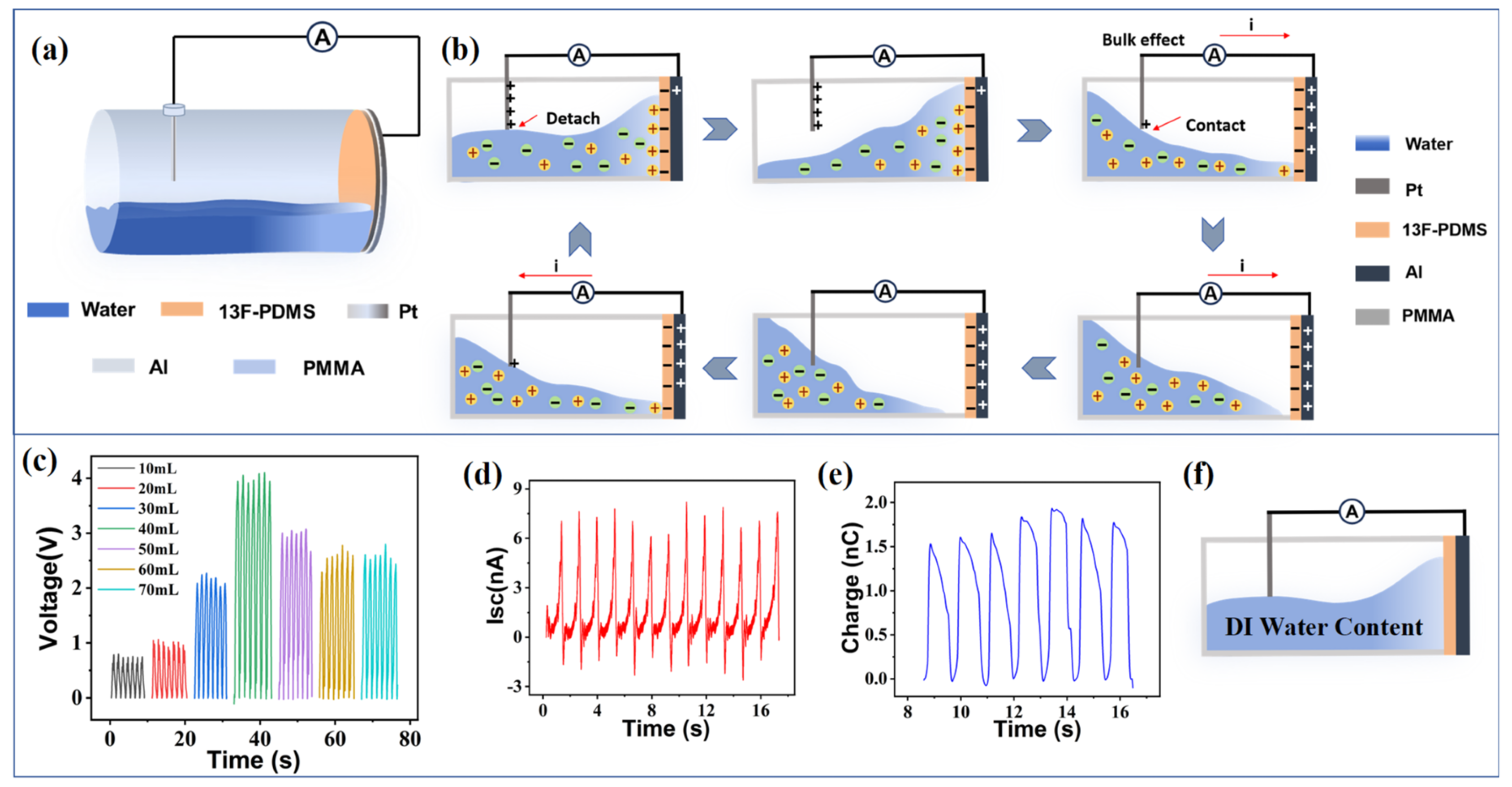 Figure 4f is a schematic diagram of the device during operation. A single device achieved an output current of up to 8.5 nA and a transferred charge of 2 nC in deionized water. Its electrification performance can be further enhanced by increasing the ion concentration in the liquid or by connecting multiple devices in series.
