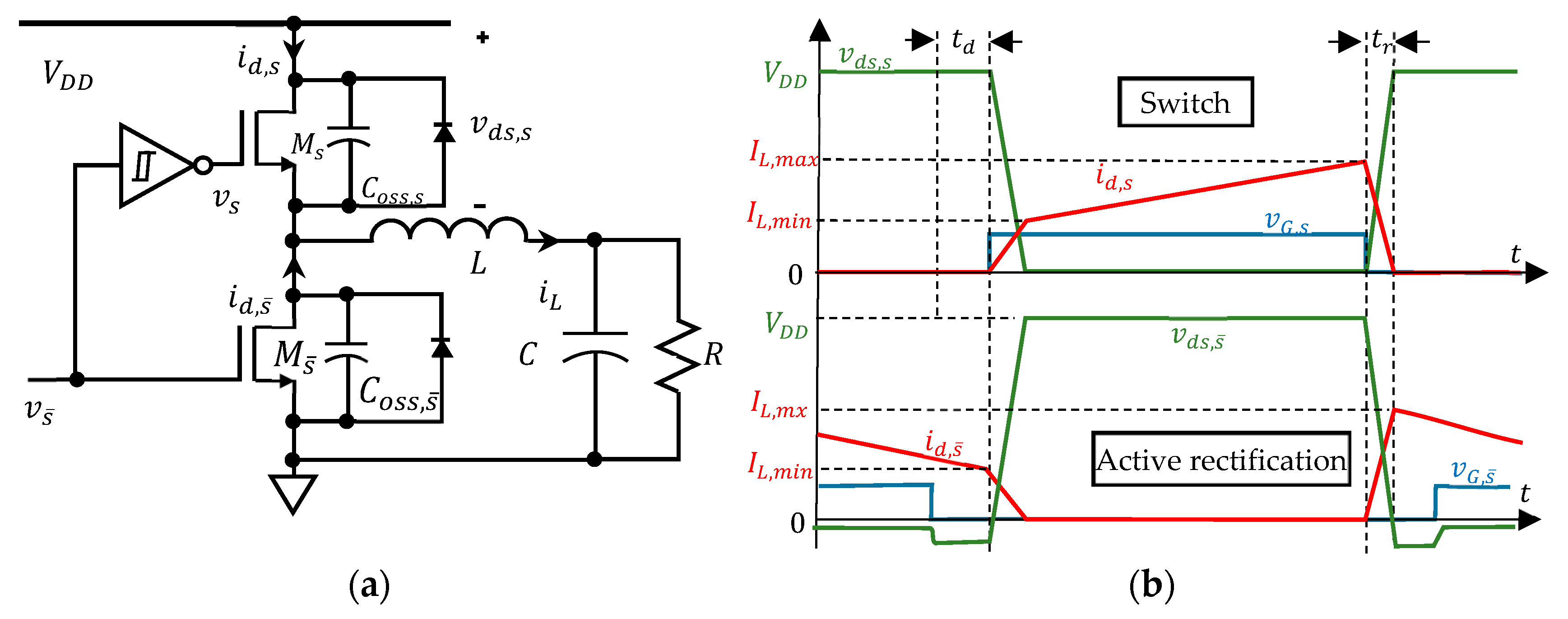 An interlocked half-bridge circuit, as shown in Figure 2a, can be used to simultaneously perform switching s and active rectification s ¯ . The interlock mechanism between switching and active rectification is implemented using an inverter with hysteresis (or dead-time) control, which prevents current shoot-through and protects both the switch and the active rectification circuit. The switching and active rectification alternately operate to direct the current into the capacitor C and the load R o . Therefore, from the switching perspective, they alternately drain their conduction channels, raising the drain-source voltage, while the other transistor fills charges into its channel to enable charge transportation. A specific instance of the switching may be shown as in Figure 2b.