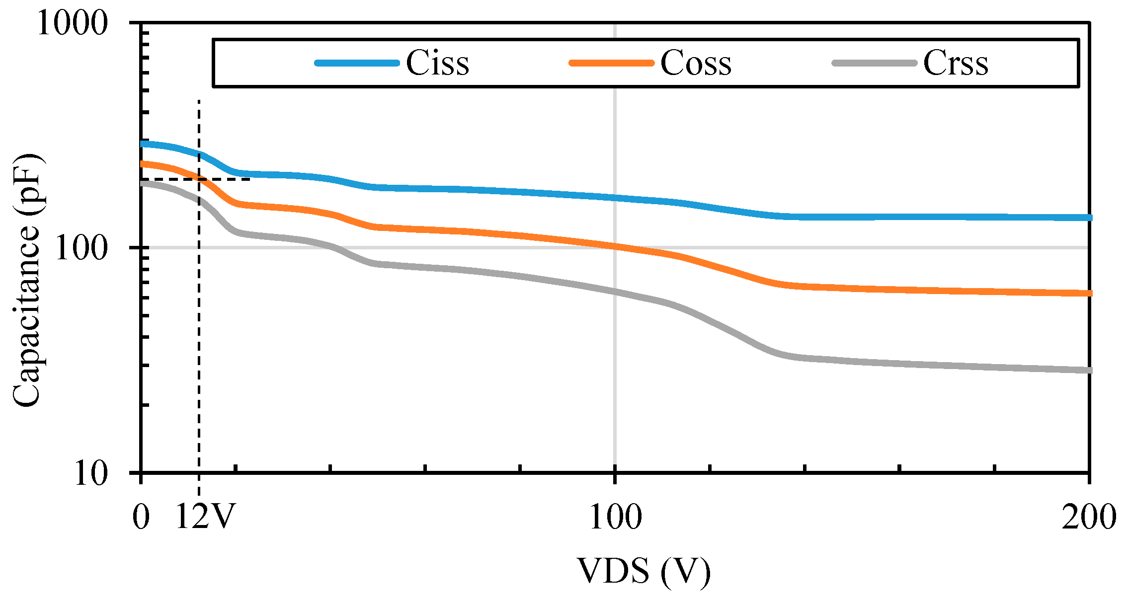 C o s s , s * denotes the parasitic output capacitance of the high-side transistor which is a GaN HEMT device in this study. The parasitic output capacitance (as shown in Figure 3) of the voltage of interest, V D D = 12   V , is two-thirds of the zero-voltage capacitance, i.e., 200 pF. The switching loss E o s s , s ¯ may be evaluated using the double pulse test [28,29] or the simplified expression in [19]. The direct dead-time loss is the energy loss due to the body diode conduction during the dead time t d .