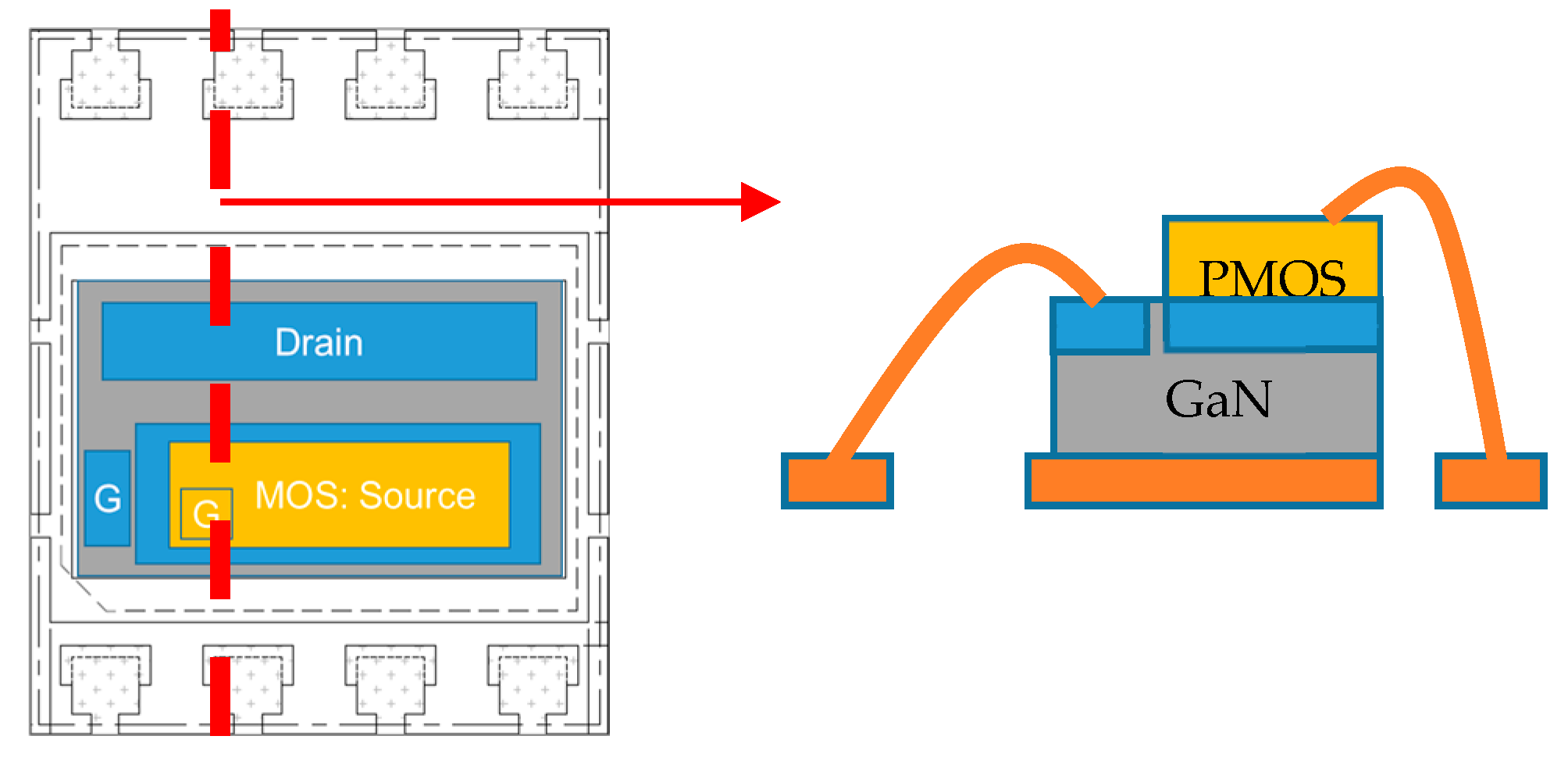 The P-cascode GaN HEMT uses an E-mode PMOS to replace the LVMOS for initial current blocking in the D-mode GaN HEMT. Simultaneously, the PMOS itself performs active rectification, reducing the number of ICs required in a package. A possible packaging method for the P-cascode GaN HEMT device (National Yang Ming Chiao Tung University, Hsinchu, Taiwan), using the Power Dual Flat No-Lead (PDFN) package, is shown schematically in Figure 5. This approach stacks the PMOS on top of the D-mode GaN HEMT to minimize the footprint.