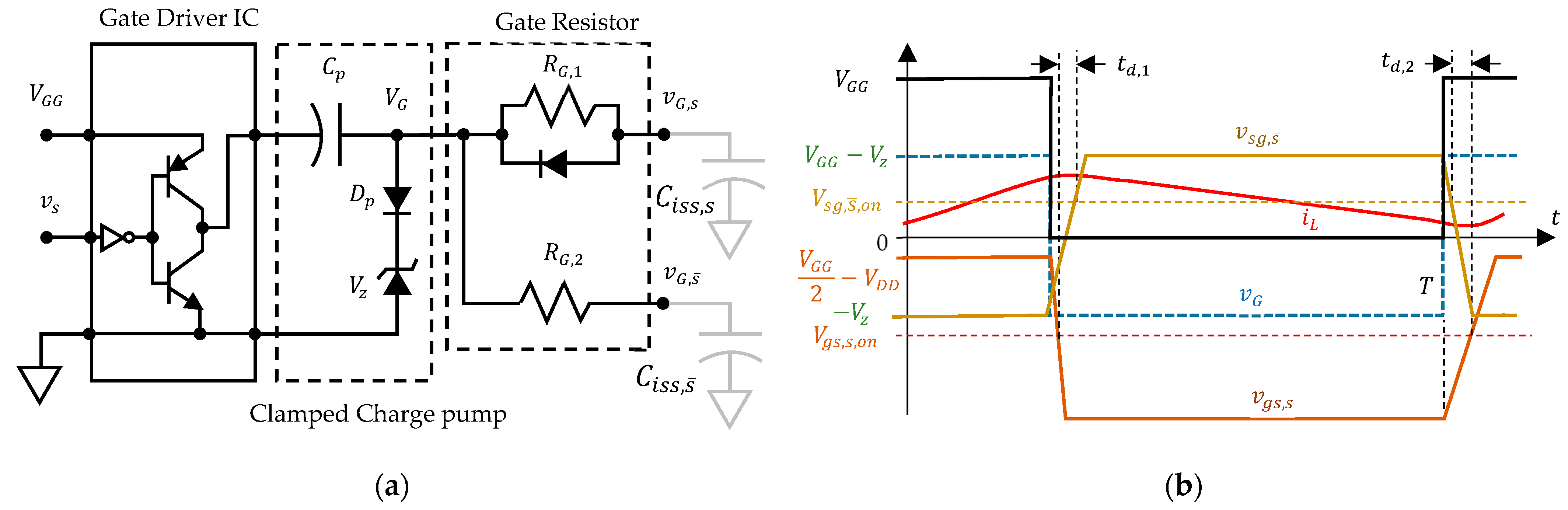 The gate driver circuit includes a gate driver IC, a clamped charge pump circuit and the gate resistor circuit as shown in Figure 7a. The gate driver IC generates sufficient current to quickly change the gate voltage levels of the transistors. The clamped charge pump circuit is a clamped design that converts the non-negative on–off voltage from the gate driver IC output into both positive and negative on–off voltages. The gate resistor circuit generates different current resistances, resulting in different time constants for the transistor gates. The responses of the input and individual outputs are shown in Figure 7b. Assuming that the input v s of the gate driver IC is a square wave, the clamped charge pump response V G can be expressed as follows.