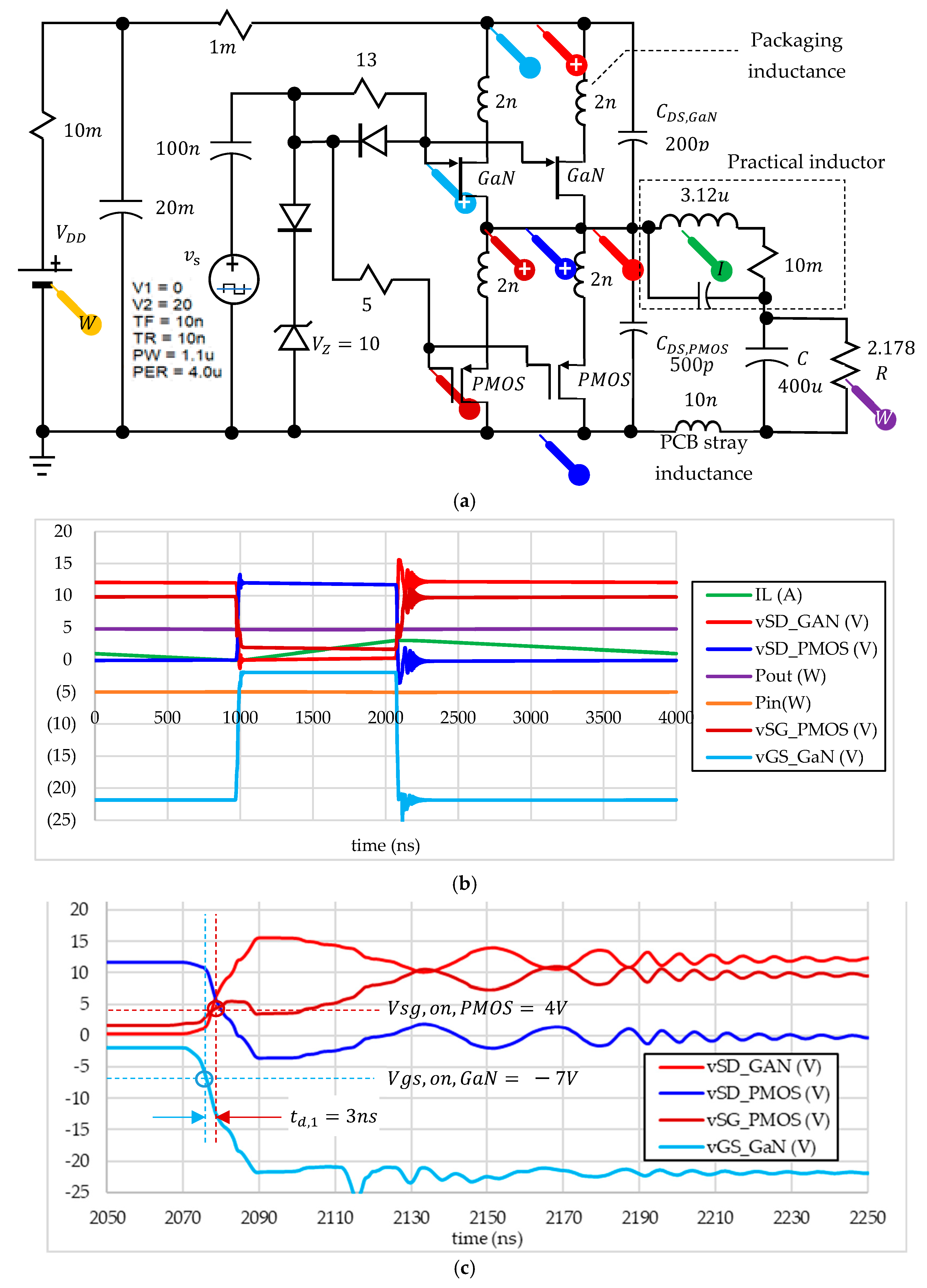 Figure 8a shows the OrCAD PSpice simulation circuit, which includes two parallel D-mode GaN HEMTs and two parallel PMOS transistors in the half-bridge configuration. All transistors have an on-resistance 100   m Ω . Therefore, the equivalent on-resistance of the switch and active rectifier is R D = 50   m Ω . The switching frequency is 250 kHz with a duty cycle of 27.5% (calculated as 1.1 μs/4.0 µs). Instead of the theoretical inductance 3.12 µH, we chose a SMT POWER INDUCTORS 3.3 µH inductor. The equivalent series resistance (ESR) and parasitic self-capacitance of a 3.3 µH inductor typically range from 5 to 150 mΩ and 2 to 30 pF, respectively, depending on the inductor’s size, construction, and rated current. In PoL applications with currents less than 5 A, we can choose 10 mΩ and 4 pF as nominal values and apply them in analog models. Stray inductance on the PCB is already included in the package inductor. The C j 0 of diode is 10 pF, which leads to a recovery effect. In Figure 8b, the inductor current (green trace) indicates that the switching mode is BCM. The switching transition between the D-mode GaN HEMT turning off and the PMOS turning on is shown on the right side of Figure 8b. The turn-on voltage of the D-mode GaN HEMT (−7 V) and the turn-on voltage of the PMOS (7 V) are indicated by the horizontal dashed lines. The gate-source voltage v g s , s of the D-mode GaN HEMT reaches the turn-off voltage earlier than the source-gate voltage v s g , s ¯ of the PMOS, resulting in a dead-time period of 3 ns. Considering the bonding inductances of the D-mode GaN HEMT and PMOS within the packaging and PCB, typically around 2 nH, we observed voltage ringing on the gate-source and drain-source voltages of the transistor when the inductor current reaches the maximum current, I L , m a x , as shown in Figure 8b. The voltage ripple caused by the parasitic inductance and parasitic components resulted in an additional 0.42 W power loss. Compared to the inductance-free output of 4.76 W from a 5 W input, the power efficiency decreased from 95% to 94.2%. Additional simulations revealed that increasing the output parasitic capacitance of either the D-mode GaN HEMT or the PMOS up to 2500 pF reduces power efficiency by less than 0.6%. This result indicates that the dead time during switching with the P-cascode GaN HEMT is beneficial for power efficiency, and the increased parasitic capacitance does not require additional attention to the dead time.