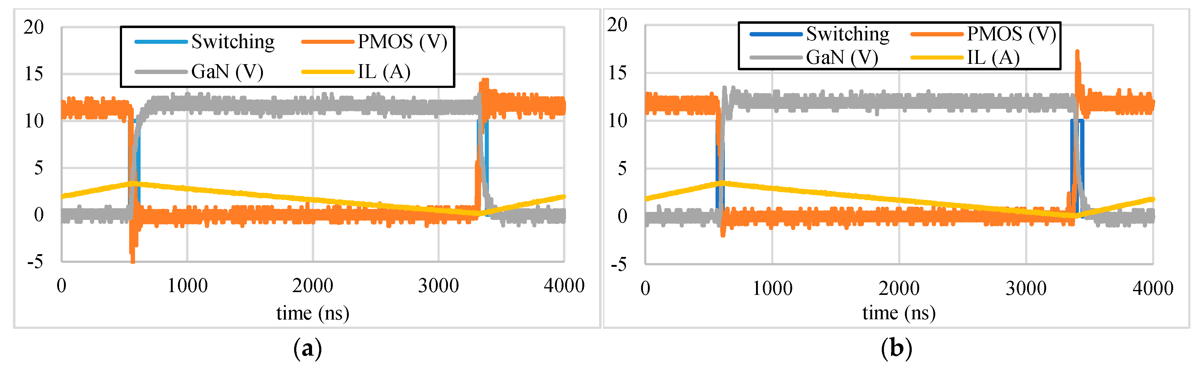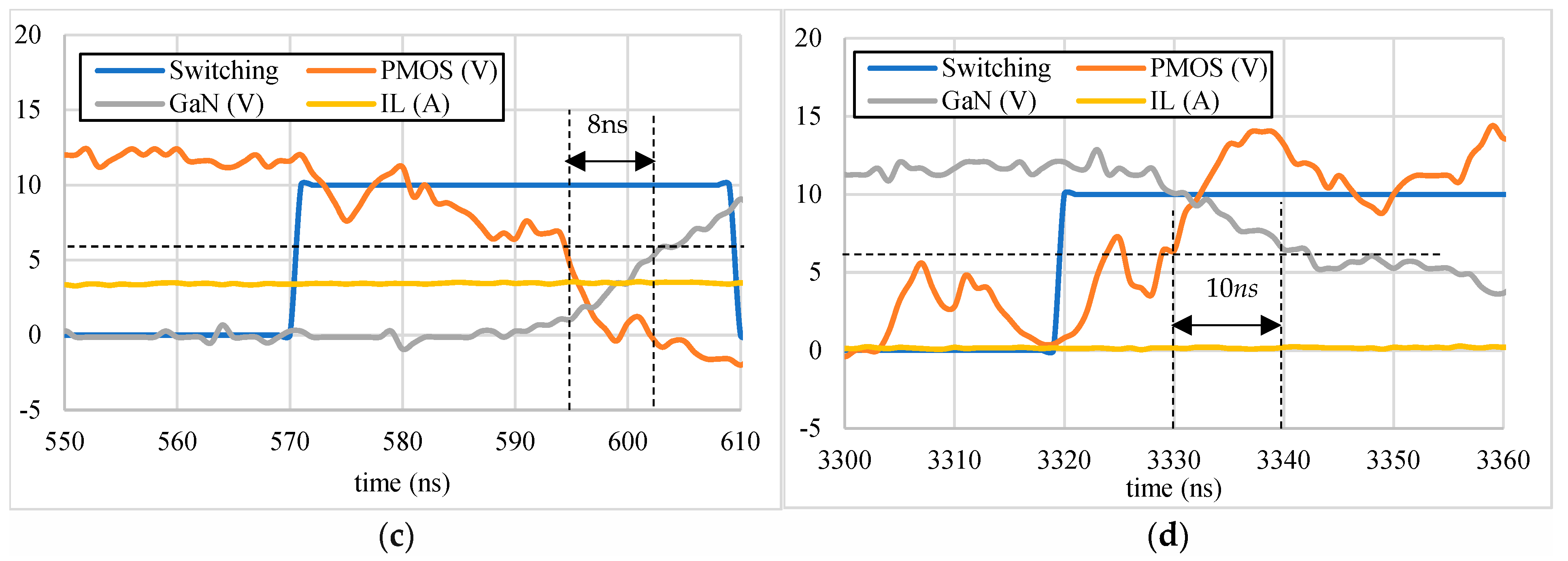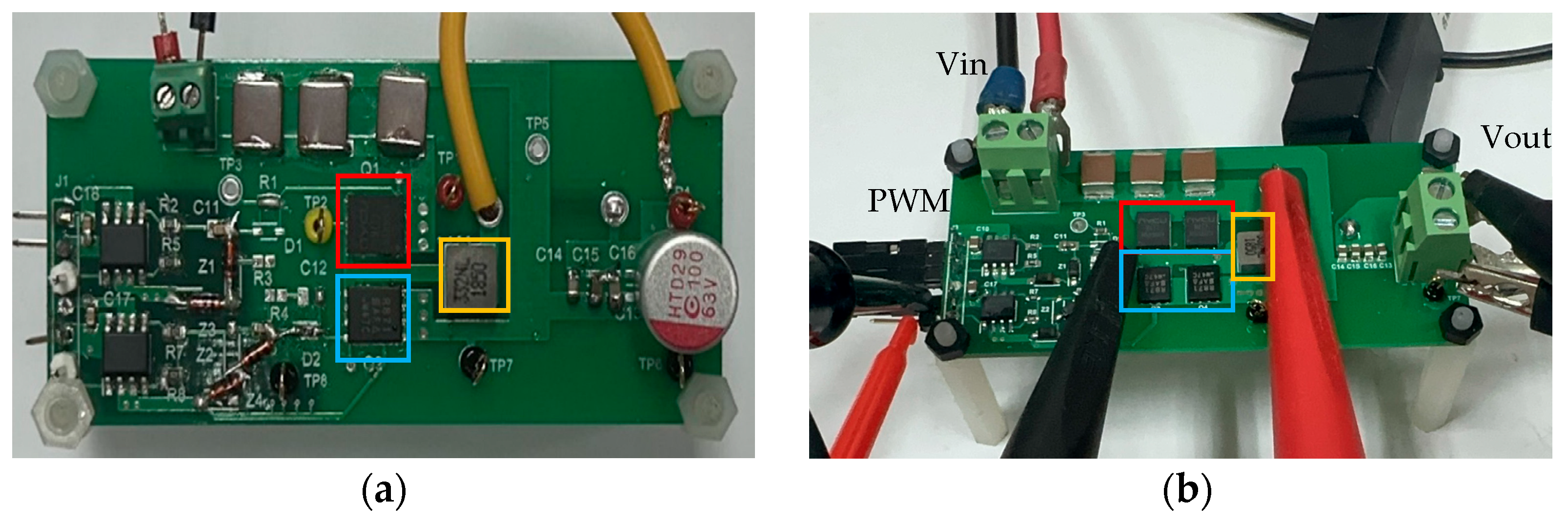 In the PSPICE simulation, we assumed that the output parasitic capacitances C O S S of both the GaN HEMT and PMOS were constant. However, this assumption still resulted in nonlinear changes in current and voltage during the conversion process, as shown in Figure 8b,c. This differs from the theoretical waveforms shown in Figure 7. Subsequent experiments will show that the even greater nonlinearity in current and voltage changes is due to the nonlinear parasitic effects of these parasitic capacitances.