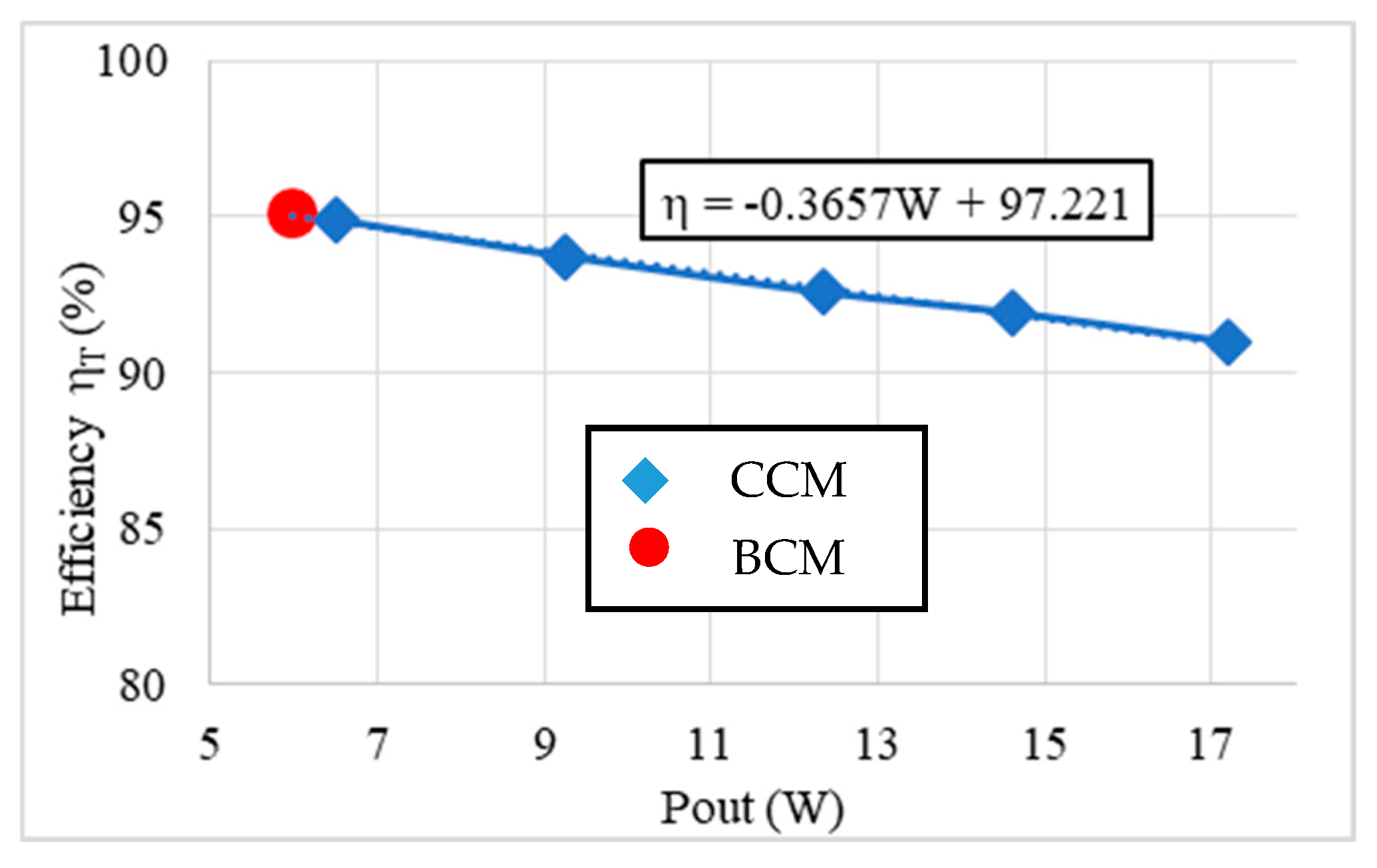 The output power rating linearly increases with the inductor current, I o = I L , and the power loss derived in (4) quadratically increases with the same current. Therefore, the transistor efficiency can decrease linearly with the output power rating. Equipped with the same circuit, the power rating is increased by reducing the output resistance R o from 2.1 Ω to 0.688 Ω and the power rating increases from 6 W to 17.2 W as shown in Figure 12. The linear regression of the efficiency versus the power rating shows the transistor efficiency is degraded by 0.366% by each output Watt increment. It is also shown that the current mode becomes CCM for a higher power rating than the rated power output 6 W for BCM. When the transistor efficiency η T requirement is 90%, the output power rating is 19.74 W and the power density is derived from the parallel P-cascode GaN HEMT arrangement in Table 2 as (19.74/5.97) × 805 = 2650 W/ i n 3 . The power density can match today’s AI server power module design specification which requires 90% transistor efficiency.