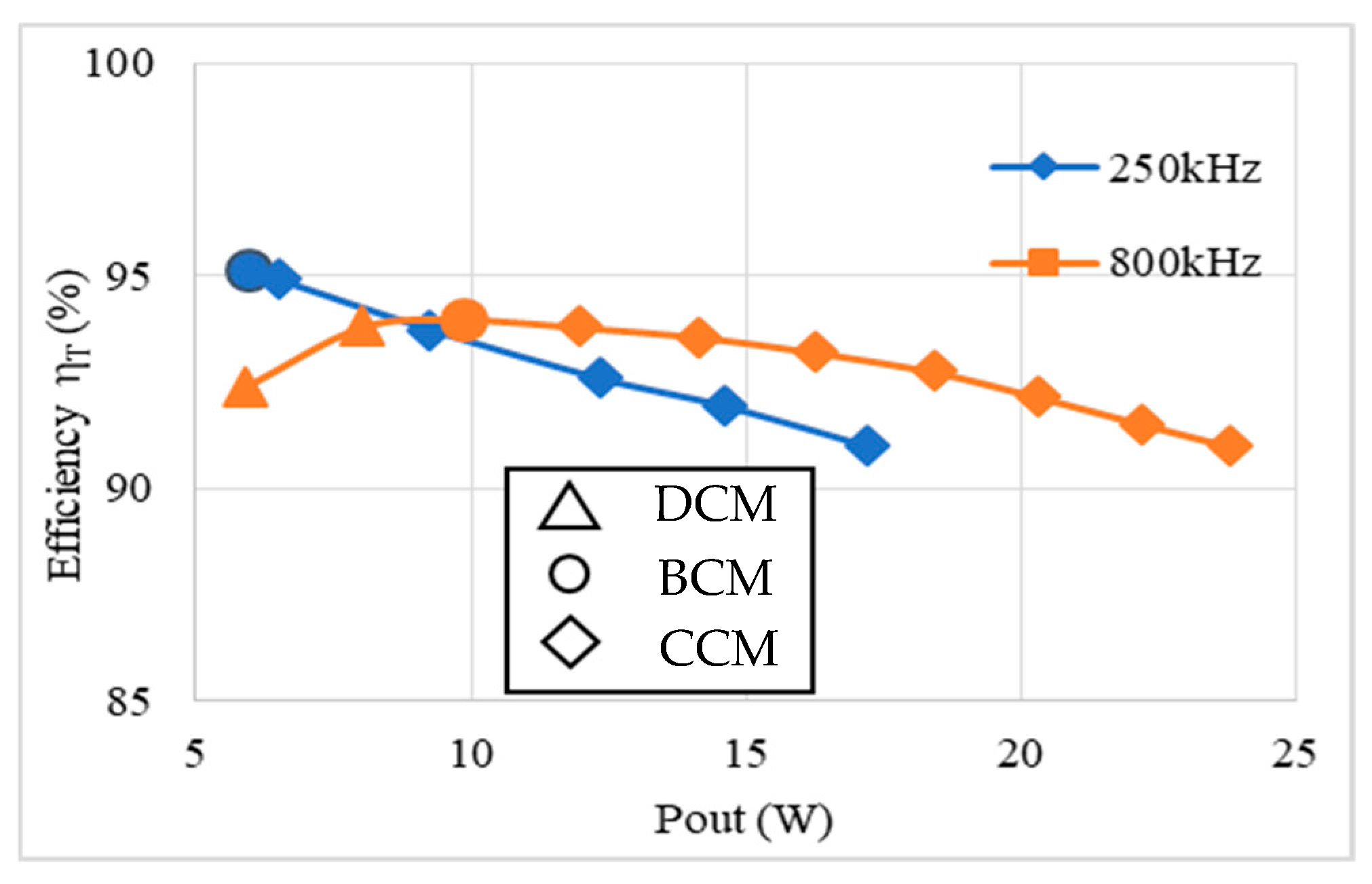 When the switching frequency increases from 250 kHz to 800 kHz when V D D = 12   V and V o = 3.3   V remained, the inductance L can be reduced from 3.3 μH to 470 nH, as predicted by (19). The equivalent series resistance (ESR) of the inductor is simultaneously reduced as the inductance decreases, owing to the shorter winding length. As shown in Figure 13, the transistor efficiencies η T are compared: the switching loss of the transistor increases with the switching frequency; therefore, the transistor efficiency of 800 kHz is lower than that of the 250 kHz application. However, the advantages of the higher switching frequency includes the BCM power rating increasing from 6W to 10 W and the 90% transistor efficiency having been extended to 25.5 W. Although, the power density is a function of the transistor efficiency η T and the input/output voltage ratio A , it is worth noting that the highest transistor efficiency always favors the BCM current mode. It is therefore convenient to compare the power density at their individual highest transistor efficiency points. Under the condition that A = 12   V / 3.3   V = 3.636 , the comparison shows that the power density for 800 kHz is 1300 W/ i n 3 @ η T = 94% and for 250 kHz is 805 W/ i n 3 @ η T = 95.01%.