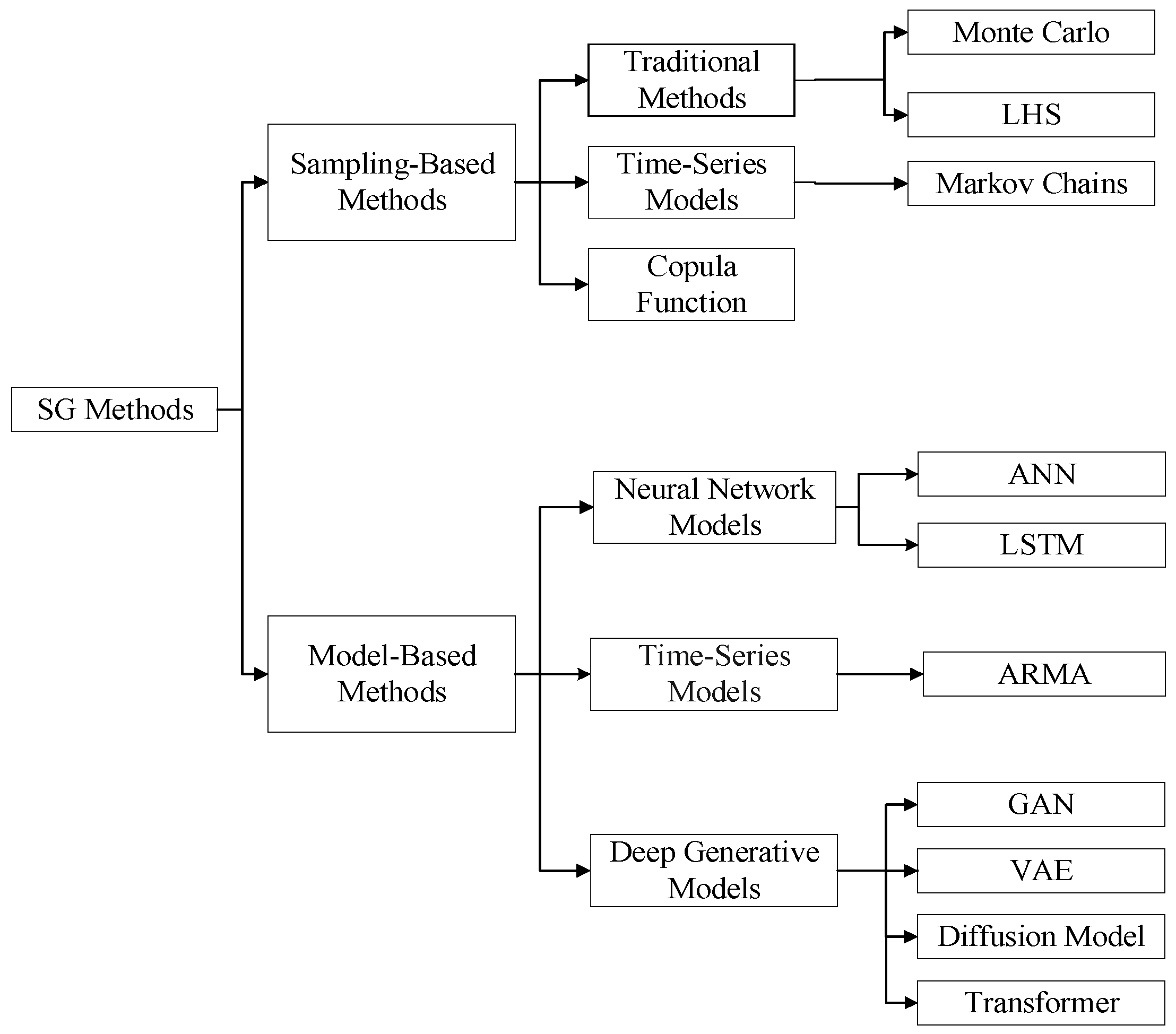5]. A series of research breakthroughs have been made in both routes: Traditional sampling-based methods represented by Monte Carlo sampling, Latin hypercube sampling, Markov chains and Copula functions have been continuously improved in terms of sampling efficiency and high-dimensional dependency modeling; data-driven model-based methods, from early time-series models such as ARMA and classical neural networks such as ANN and LSTM, to deep generative models represented by GAN, VAE, diffusion models and transformer-based architectures, have achieved leaps in the fidelity, diversity and computational efficiency of SG. However, through the combing of existing research, we find that there are still obvious gaps in the current academic community in the systematic sorting and comprehensive review of renewable power SG technology.