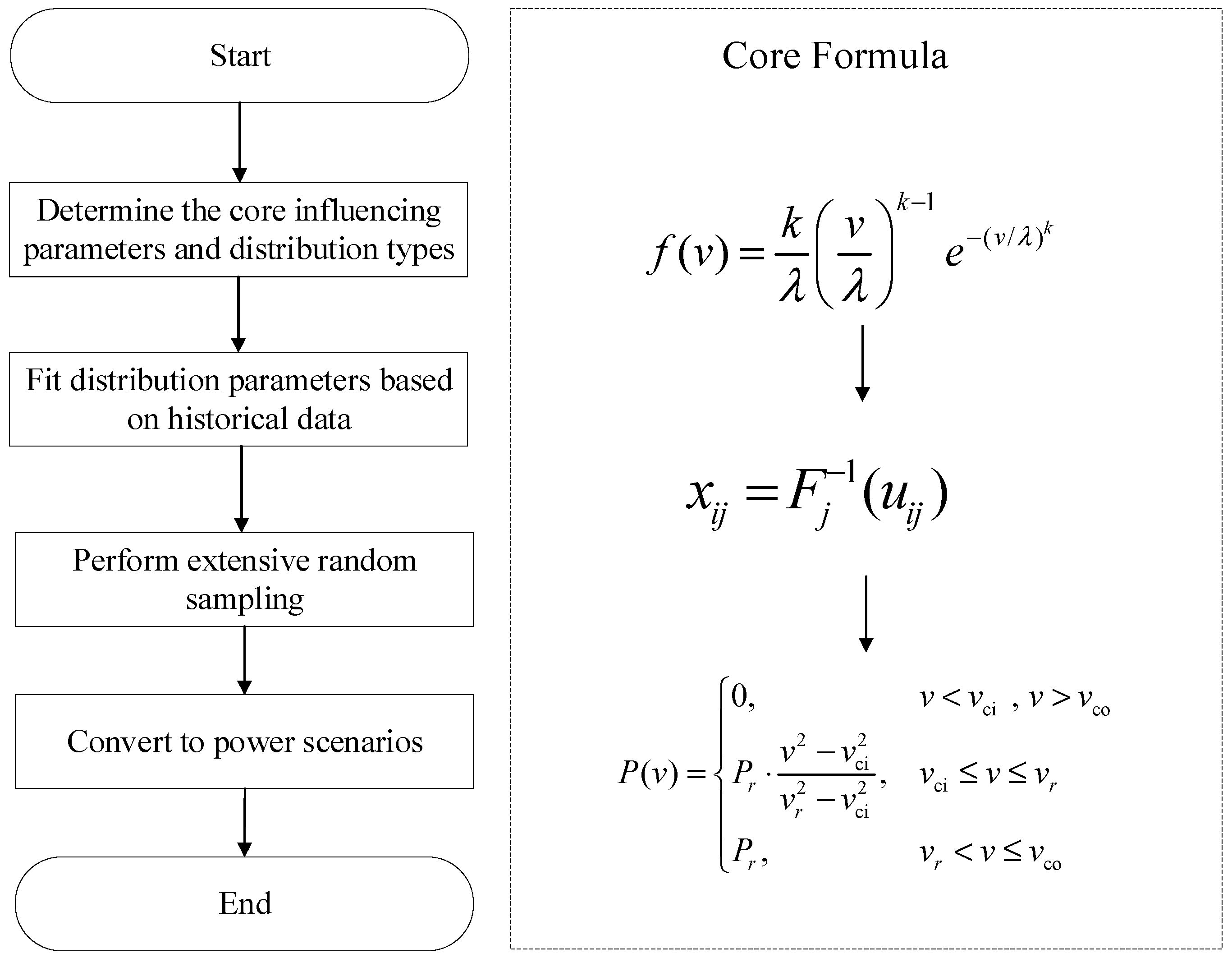 25]. Typically, these methods start with key assumptions. They assume that the core meteorological parameters governing renewable power output follow specific probability distributions. For instance, wind speed is often assumed to follow a Weibull distribution [