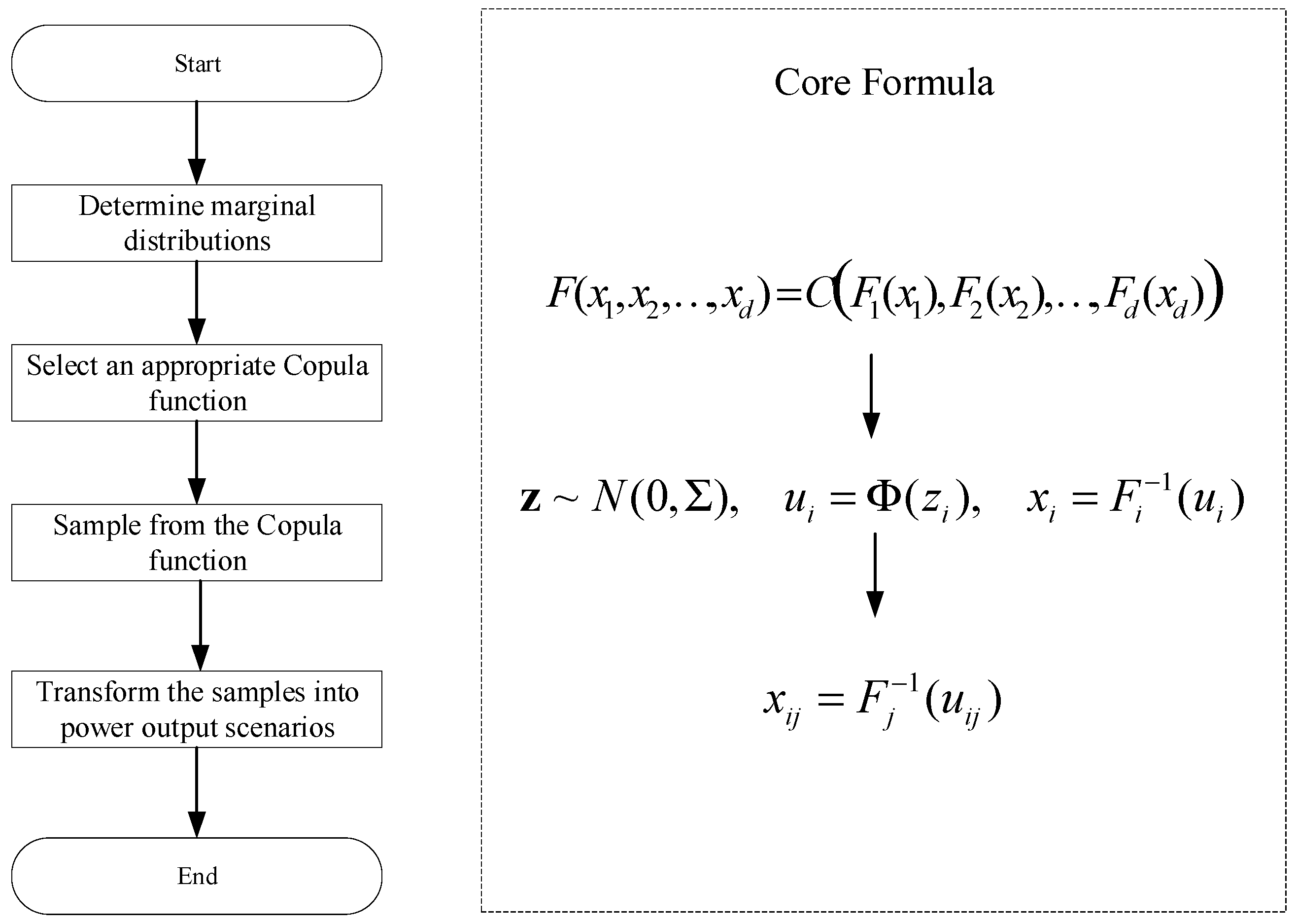 Sampling-based methods follow the paradigm of modeling the joint distribution first, then generating samples via sampling. Specifically, they first explicitly or semi-explicitly define the N-dimensional joint probability distribution and spatial dependence structure of renewable farm outputs via statistical methods (e.g., Copula functions), then extract samples from the predefined distribution via sampling algorithms. For Copula-based sampling, the parameter space of the N-dimensional dependence structure grows at or even exponentially. For example, a Gaussian Copula requires fitting an N × N correlation matrix, which involves 4950 independent parameters when N = 100. Consequently, this paradigm is inherently limited by the curse of dimensionality.