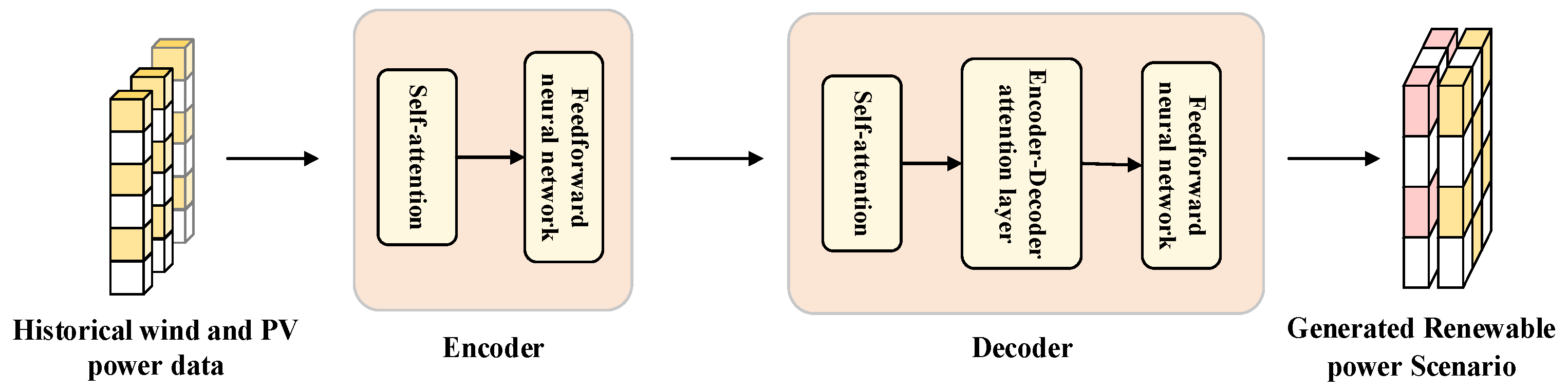 114]. First, a deep neural network architecture inspired by the transformer algorithm is developed to capture the temporal characteristics of renewable energy output. Subsequently, combined with the strengths of the Wasserstein generative adversarial network with gradient penalty (WGAN-GP) in data generation, the transformer-WGAN-GP framework is proposed for short-term renewable energy output SG. Finally, experimental validation is conducted on open-source wind energy and PV datasets from the U.S. National Renewable Energy Laboratory (NREL), to evaluate the performance of the proposed model in renewable energy output SG across multiple dimensions, including expectation, variance, PDF, CDF, Power Spectral Density (PSD) and autocorrelation coefficient. The results show that the proposed method outperforms the standalone WGAN-GP model, VAE model, Copula function model, and LHS model across all the aforementioned evaluation metrics, and provides a more accurate representation of the probability distribution of short-term renewable energy output.