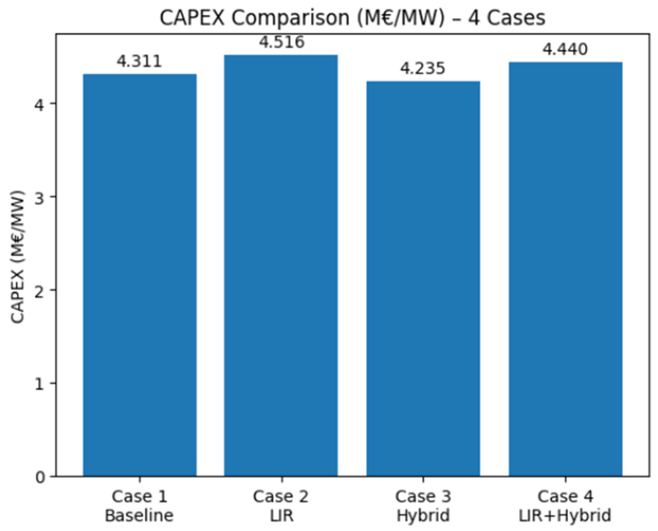 To enable a consistent comparison between the baseline, LIR, hybrid, and combined cases, turbine, substructure, and construction-related costs are evaluated within the same accounting structure and techno-economic framework. This does not imply that the baseline case represents a literal Celtic Sea project or that the hybrid case represents a fully localized Korean FEED estimate; rather, all four cases are assessed as Ulsan-oriented comparative scenarios under harmonized benchmark assumptions.