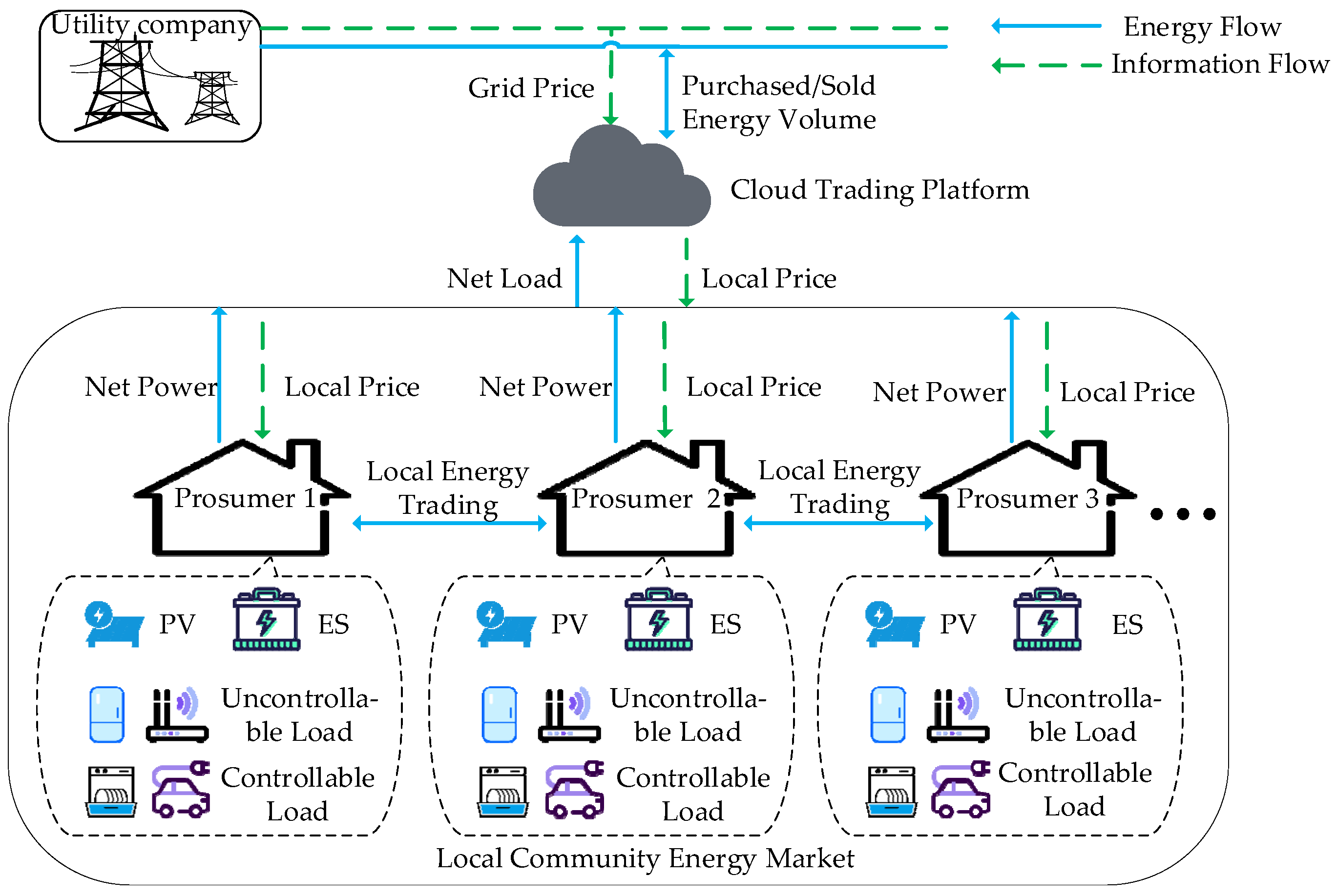 In the centralized training phase, to tackle the dual shortcomings of traditional multi-agent algorithms—namely, the input dimensionality explosion of the value network caused by the crude concatenation of global states, and the inability of mean-field methods to capture complex game relationships—this paper introduces the Transformer encoder into the centralized value network (Critic) to establish a spatial attention mechanism. Under the CTDE architecture, the single Critic network is deployed on the aforementioned Cloud Trading Platform during the training phase, and its input is reconstructed as a feature sequence . denotes the global aggregation feature that characterizes the collective trading behaviors of the community. In the community energy system, the interaction relationships among prosumers change dynamically in real-time according to supply and demand states. For instance, when prosumer i is in a power deficit state, it will prioritize attention toward neighbor j who is in a surplus state. The Transformer utilizes a Multi-Head Self-Attention mechanism to accurately model this dynamic coupling at both physical and economic levels.