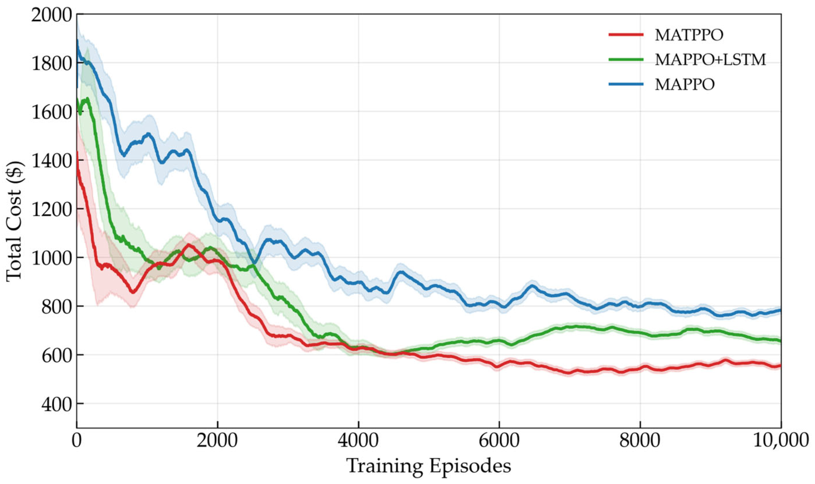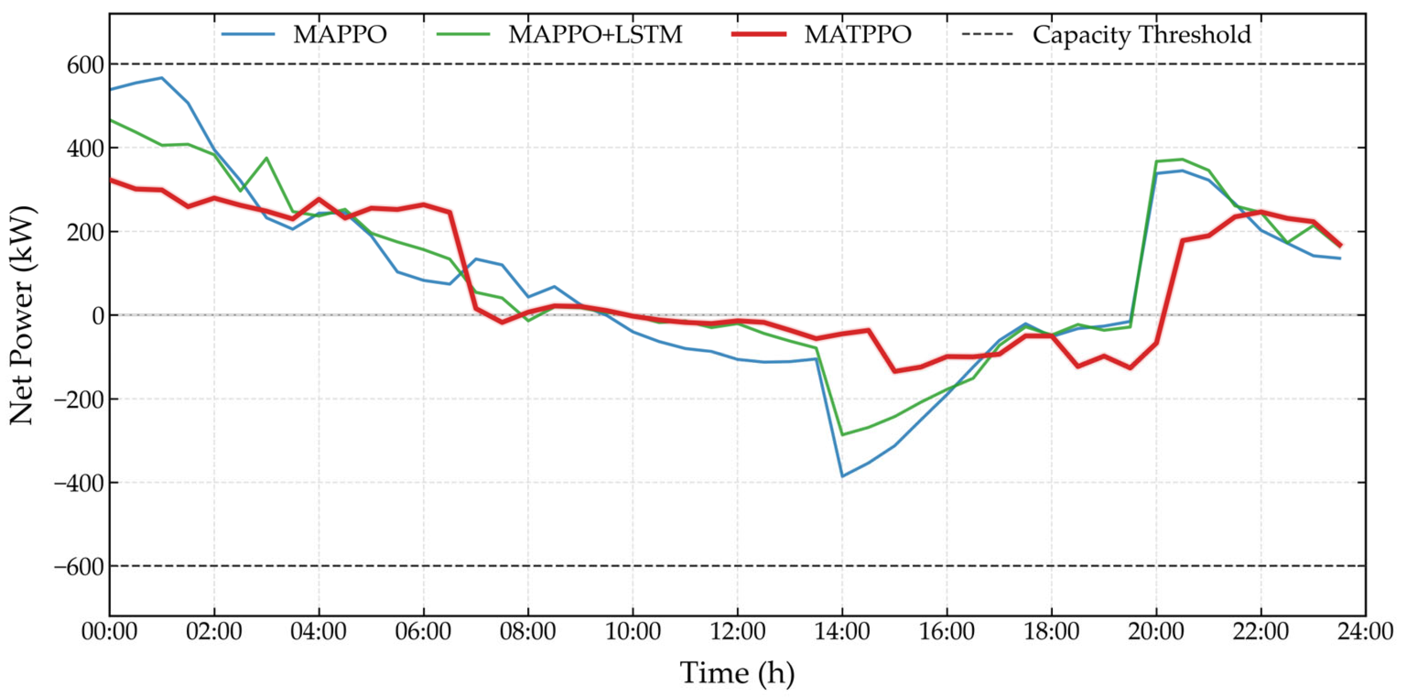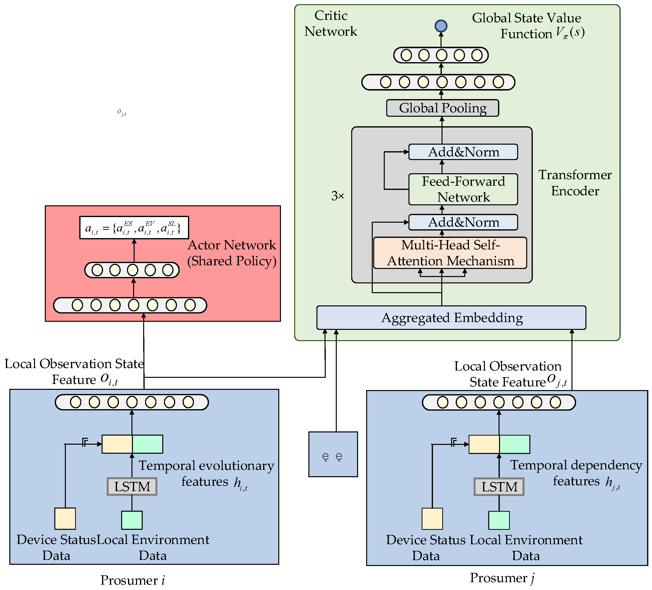 To address the challenges of partial observability and the privacy protection requirements among multi-agents in community energy management, this paper adopts a CTDE architecture and proposes a MATPPO algorithm that integrates LSTM and Transformer. The network framework of this algorithm is illustrated in
