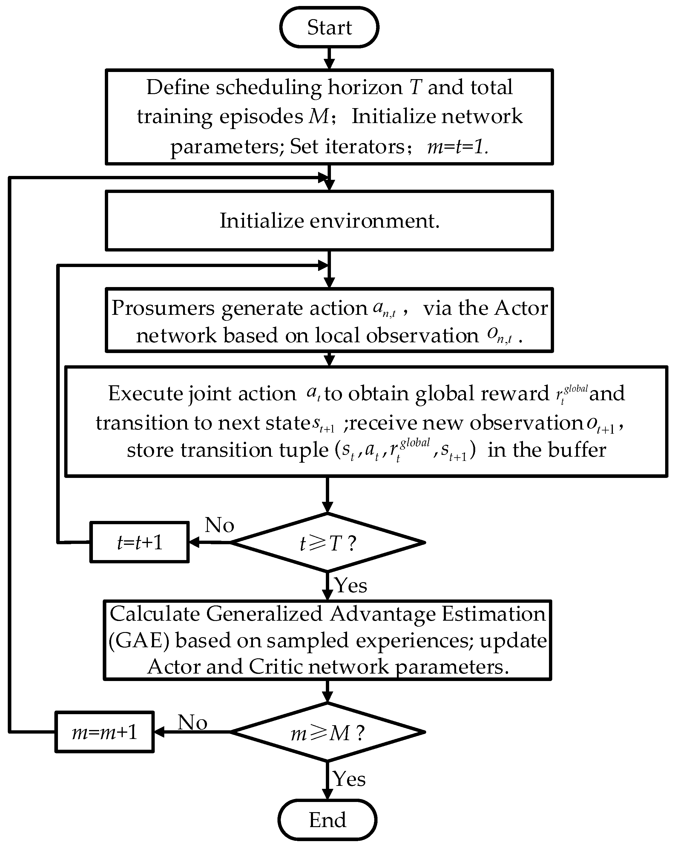 Given that community energy management is intrinsically a control problem within a continuous action space, the PPO algorithm based on the Actor–Critic framework is well suited to effectively address challenges associated with high-dimensional state spaces and stochasticity. Thus, this paper adopts the PPO algorithm for policy optimization. The specific execution and parameter update process of the MATPPO algorithm is illustrated in