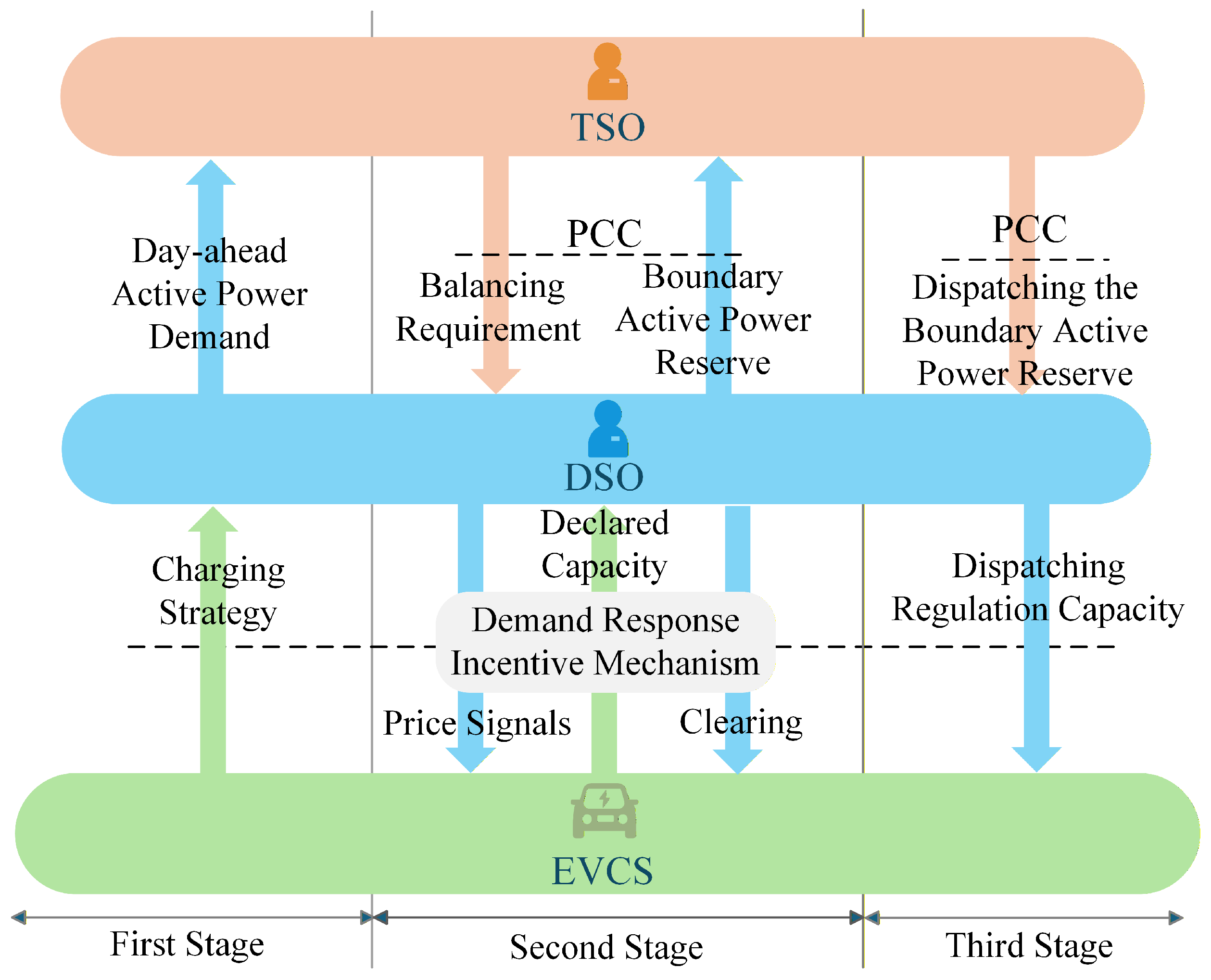Figure 1. Specifically, a DSO-managed TSO-DSO coordinated interaction model is considered, where the DSO is responsible for the management and coordination of distributed EVCSs. The first stage is defined as the day-ahead demand submission stage. In this stage, each EVCS is modeled as a virtual energy storage system via the Minkowski summation method. Under the assumption that EVCSs act as price takers, their day-ahead charging/discharging power
