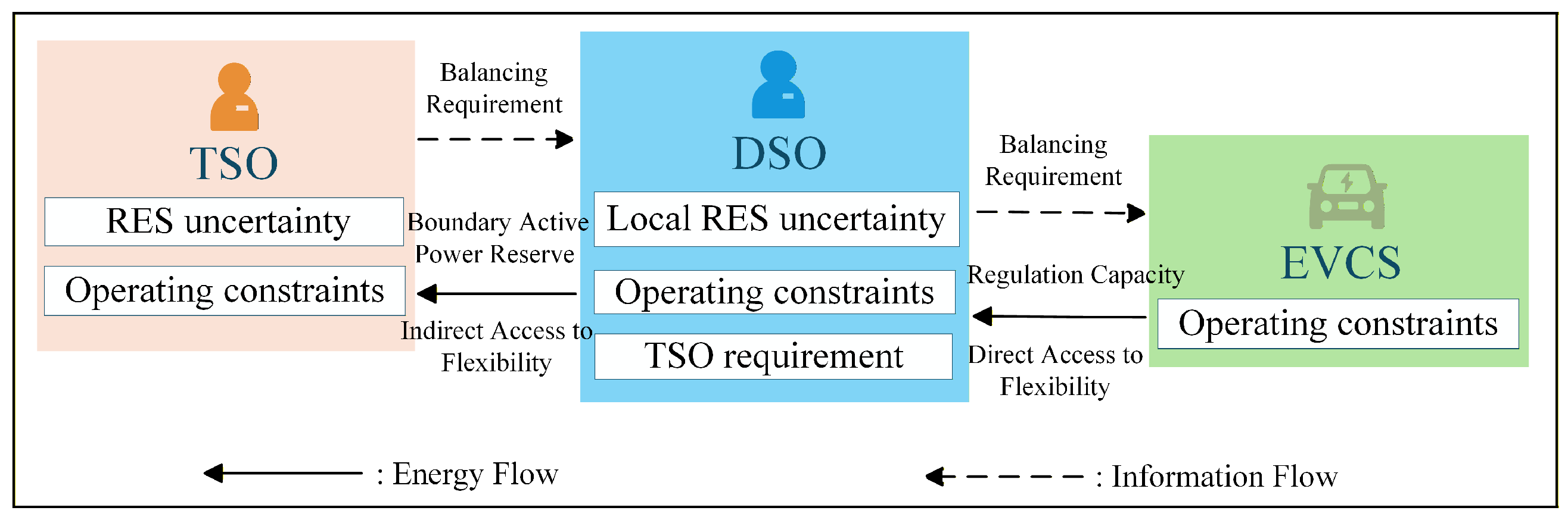 15] did not account for its impact on distribution system operation, and proposed an EVCS capacity assessment method under a transmission–distribution coordination framework, showing that by considering distribution network constraints to optimize the operational boundary of EVCS, EVCS can provide ancillary services to both transmission and distribution networks simultaneously. Nevertheless, since the TSO indirectly accesses flexibility through boundary buses and lacks visibility into DSO operational information, adjustments to boundary-bus power by the TSO during practical operation may still jeopardize distribution network operational security, thereby compromising the reliable delivery of EVCS reserve capacity determined in [