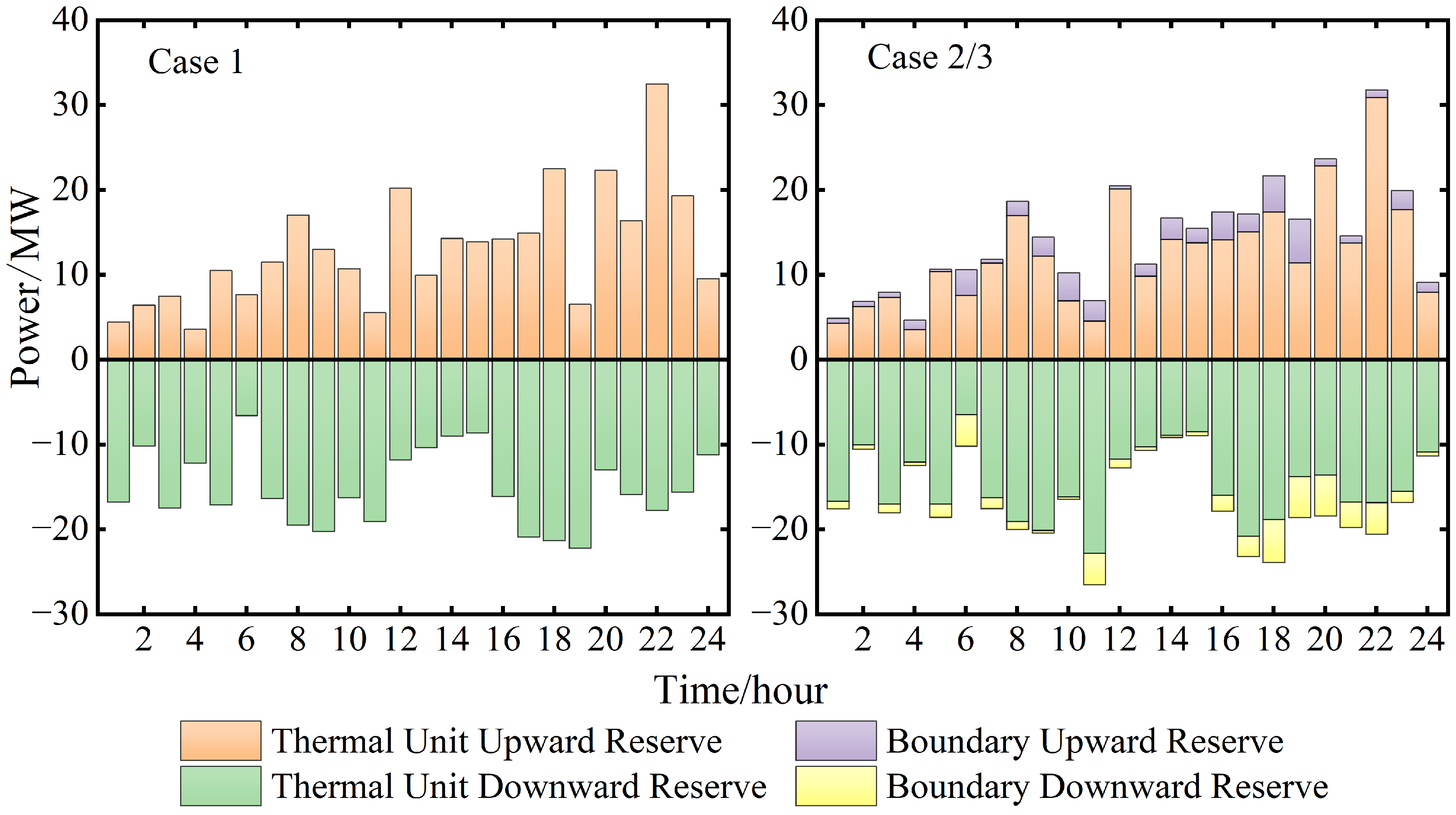 Table 7 compares the boundary active reserve and boundary violation results of Cases 4 and 7. The results show that, compared with Case 4, the upward and downward boundary active reserves in Case 7 increase by 11.59 MW and 9.28 MW, respectively, whereas the boundary violation under the worst-case scenario increases by 10.89 MW. This indicates that, without considering the uncertainty of intraday operational requirements, the deliverability of boundary active reserve is significantly reduced, and the DSO may face severe economic penalties.