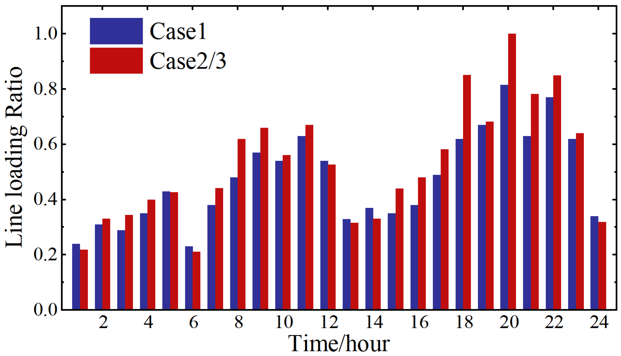 Figure 5 illustrates the daily change in the loading ratio of Line 33 in Cases 1–3 for the T30D2 system. It can be observed that, in Case 1, both the maximum and average line loading ratios are lower than those in Cases 2 and 3. For Line 33, which exhibits the highest loading ratio among all lines, the maximum loading ratio decreases by 18.4 percentage points, and the average loading ratio decreases by 5.4%. During the evening peak-load period, the loading ratio of Line 33 is notably reduced at 18:00, 20:00, and 21:00. The transmission network can alleviate line congestion by leveraging the flexibility provided by EVCSs at the boundary buses: