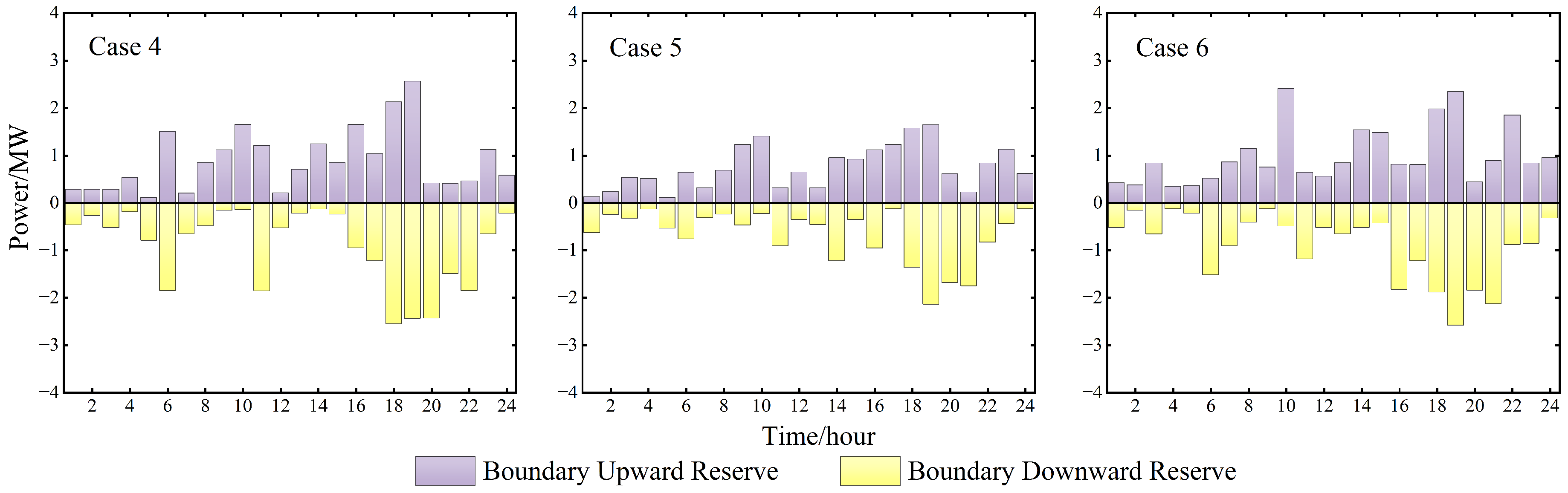 Figure 6 illustrates the comparison of boundary active power reserves obtained from the coordinated dispatch solutions for Cases 4–6. It can be observed that compared with Case 5, Case 4 achieves a more adequate boundary active power reserve.