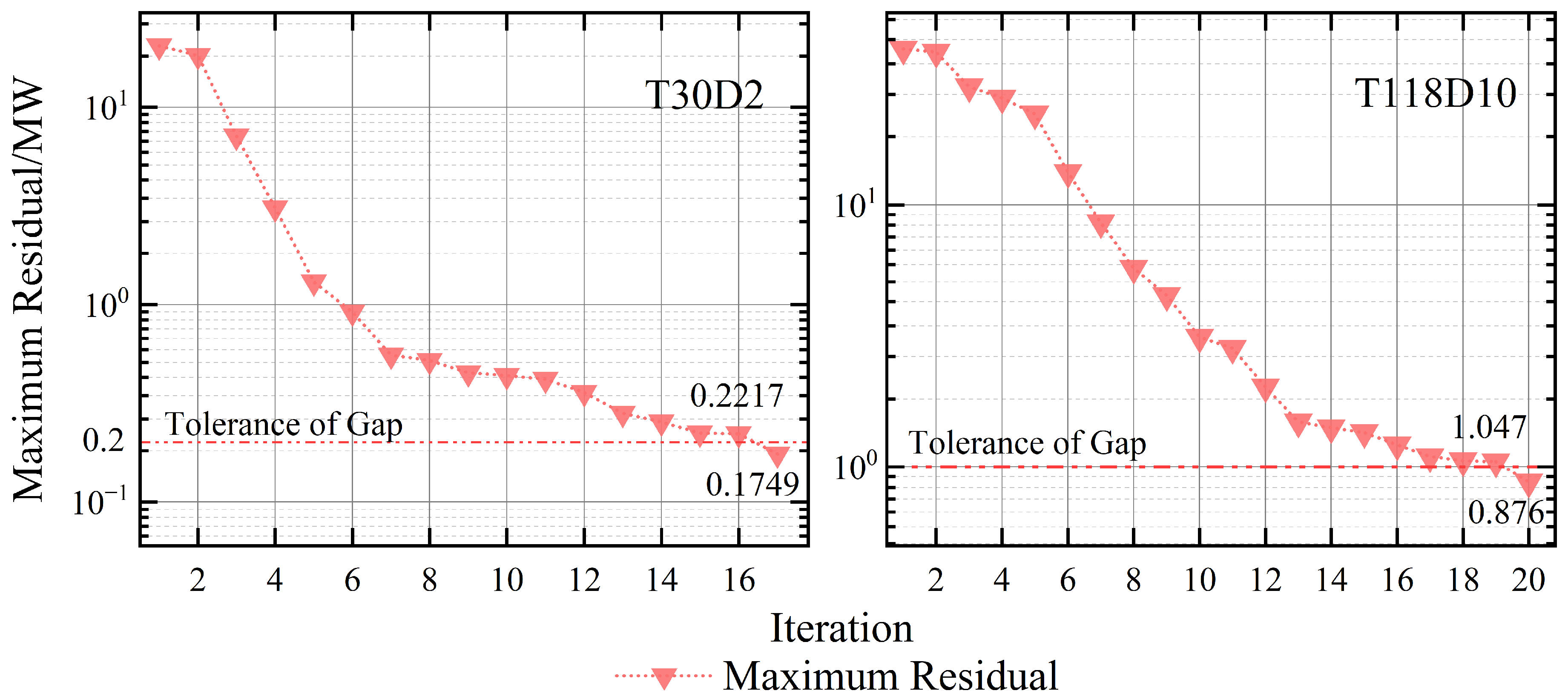 Figure 8 illustrates the convergence evolution of the ADMM-C&CG algorithm for the T30-D2 system. As in [