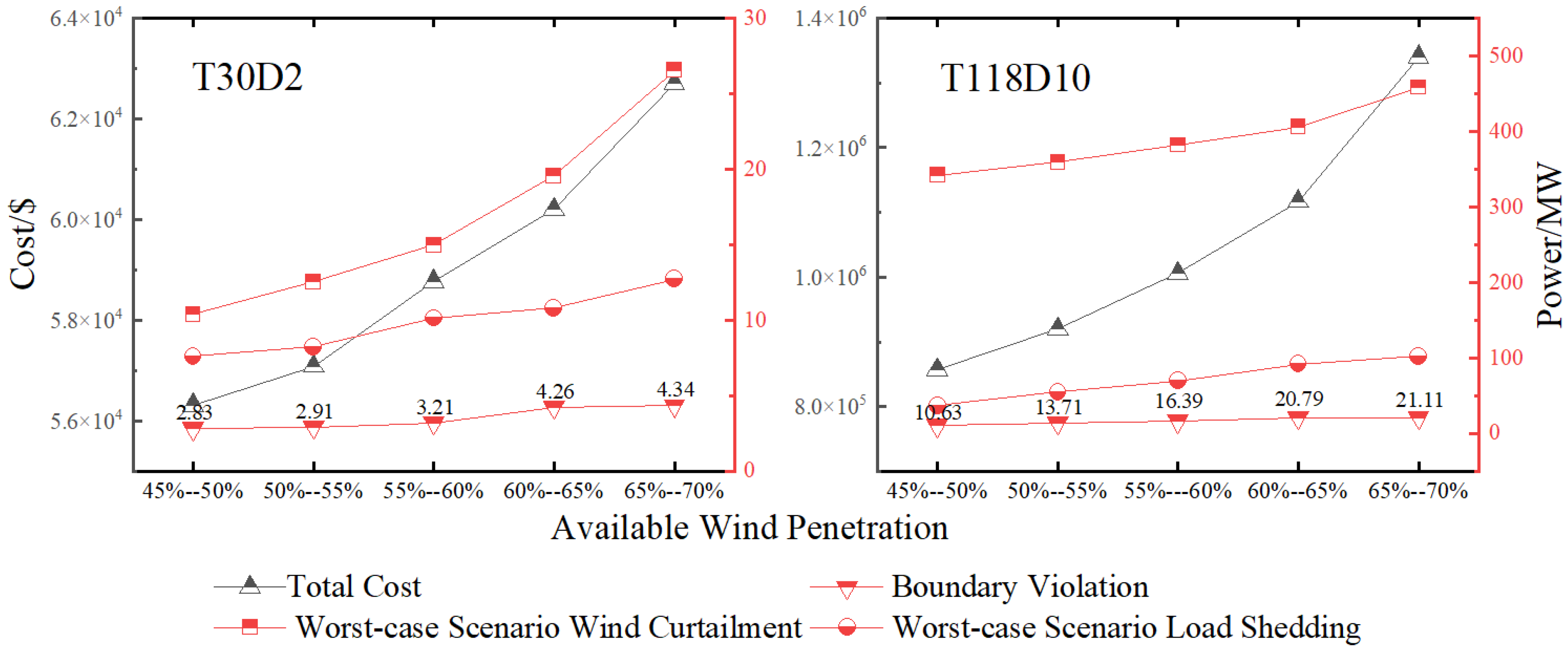 Figure 9 illustrates the operating results of the T30D2 and T118D10 systems as the available wind penetration increases from 45–50% to 65–70%. As the available wind penetration rises, the total system cost, the worst-case scenario wind curtailment, load shedding and boundary violation all exhibit an increasing trend. When the available wind penetration increases from 45–50% to 60–65%, these indicators grow relatively slowly, indicating that, under relatively low system flexibility requirements, EVCSs can provide lower-cost flexible resources to satisfy the regulation needs of both the TSO and DSO. However, when the available wind penetration is further increased from 60–65% to 65–70%, all indicators increase significantly. This is because the flexibility provided by EVCSs is no longer sufficient to meet system requirements, and the TSO relies on thermal units to provide the remaining flexibility, resulting in higher operating costs. Meanwhile, the DSO has to maintain secure system operation through wind curtailment or load shedding: