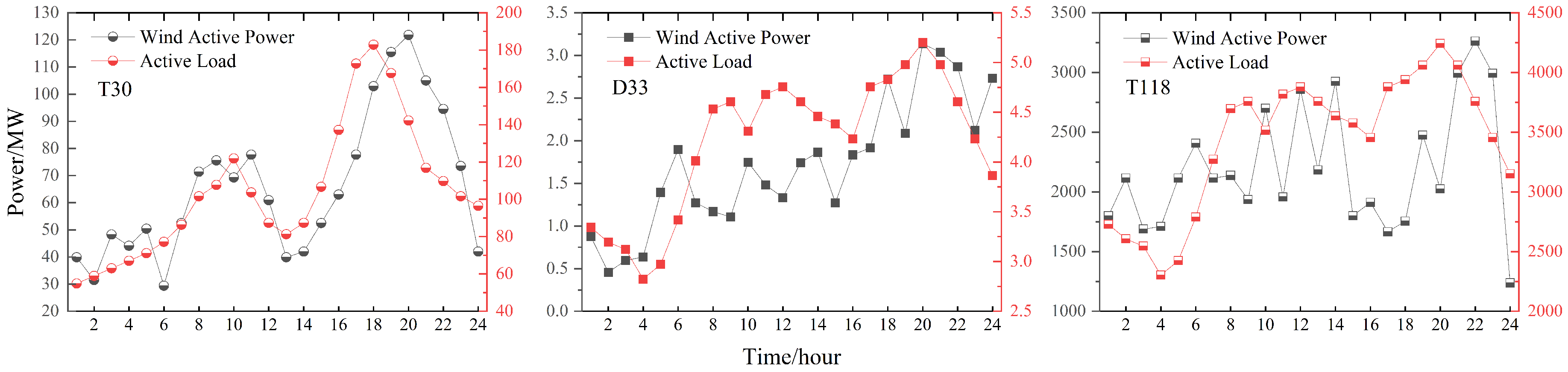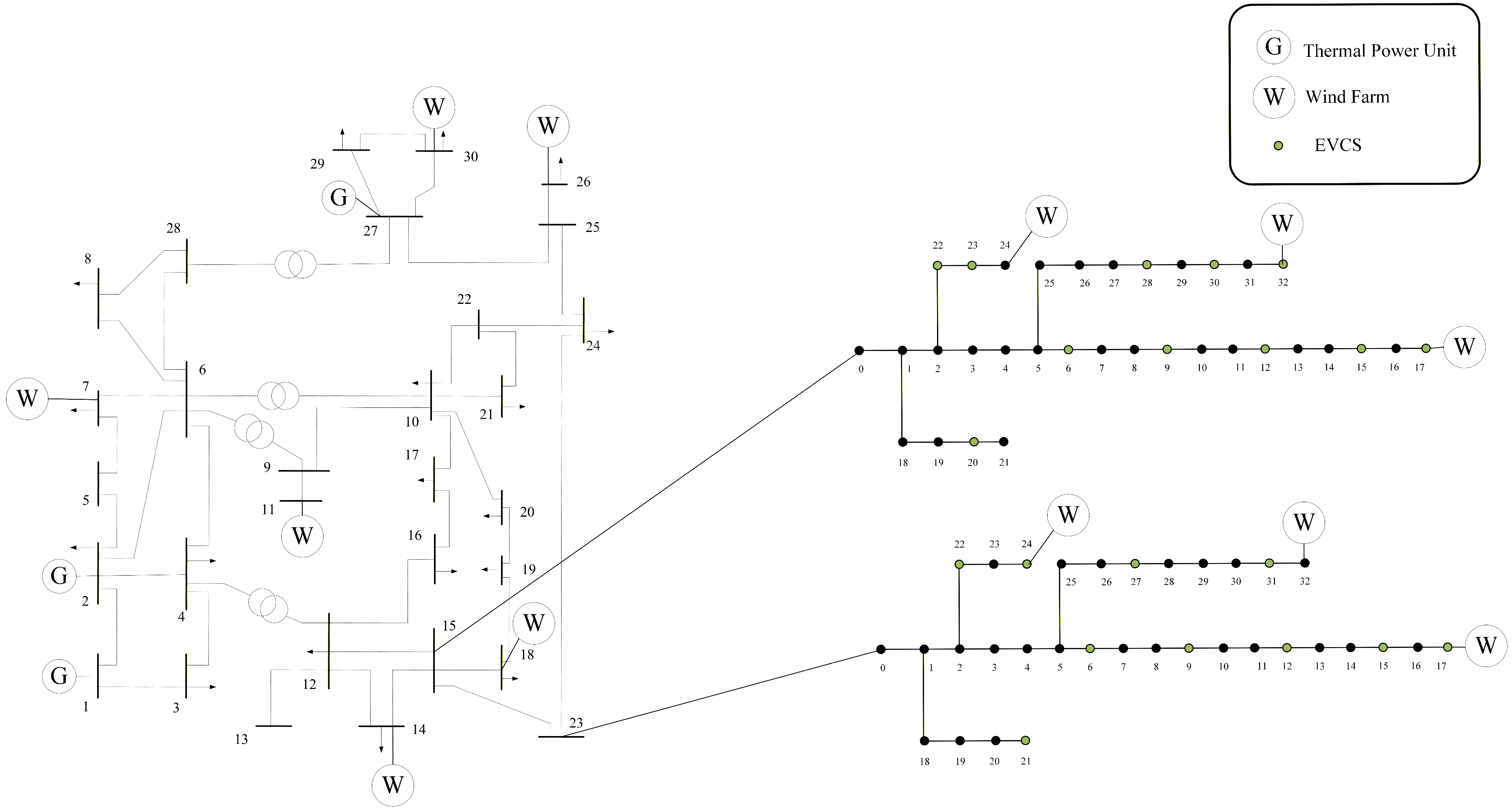 To verify the effectiveness of the proposed method, this paper designs a T30D2 test system for analysis. T30D2 refers to a modified 30-bus transmission network connected to two modified 33-bus distribution networks. The boundary buses are located at buses 15 and 23 in T30, and thermal power units are installed at buses 1, 2, and 27, with a total installed capacity of 190 MW. Wind farms are sited at buses 7, 11, and 14, with a peak capacity of 122 MW. In the D33 networks, distributed wind farms are placed at buses 17, 24, and 32, with a peak capacity of 3.14 MW. EVCSs are installed at buses 6, 9, 12, 15, 17, 20, 22, 23, 28, 30, and 32. The EVCS data are generated using a scenario clustering method, with clustering data sourced from the CalTech EV dataset [