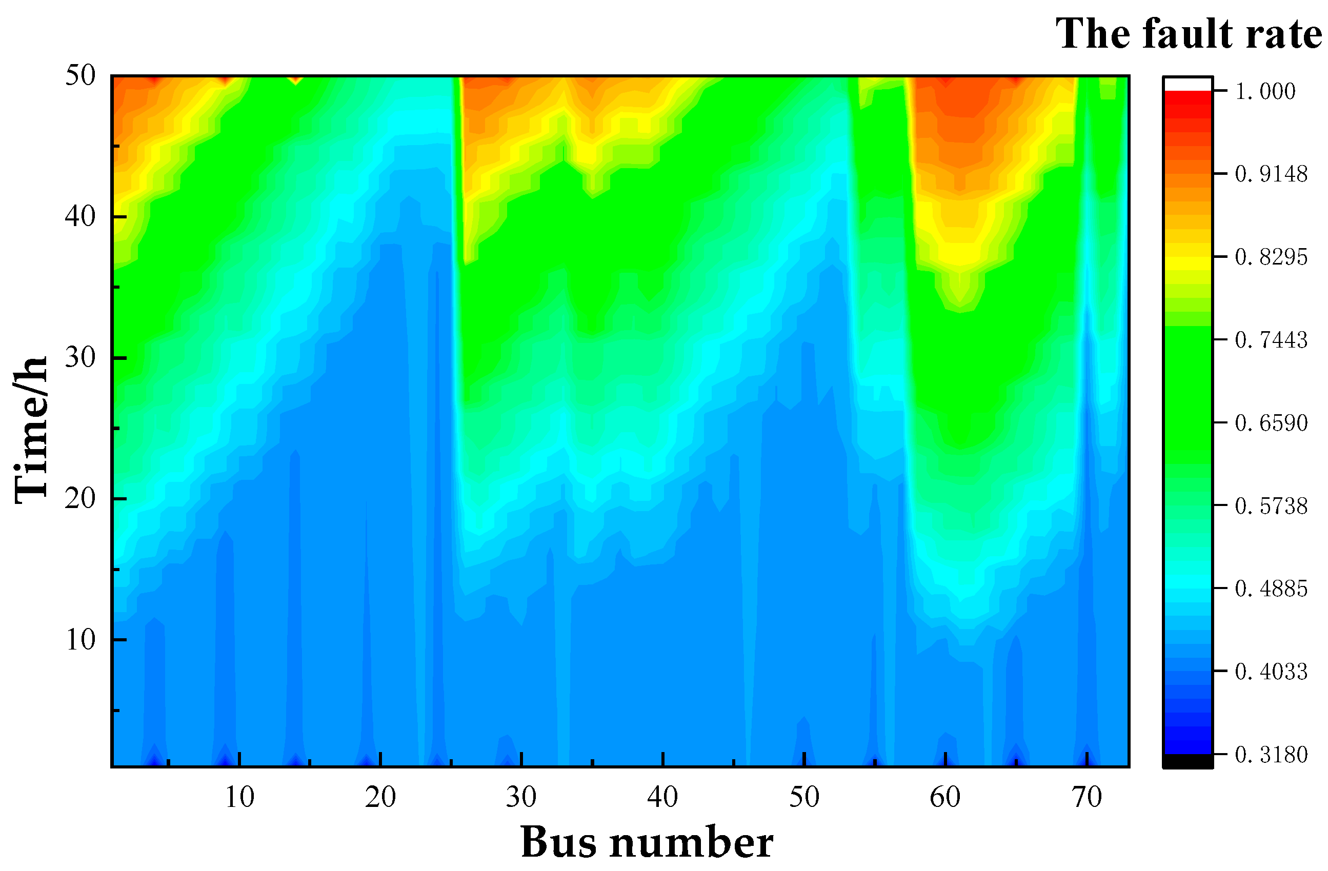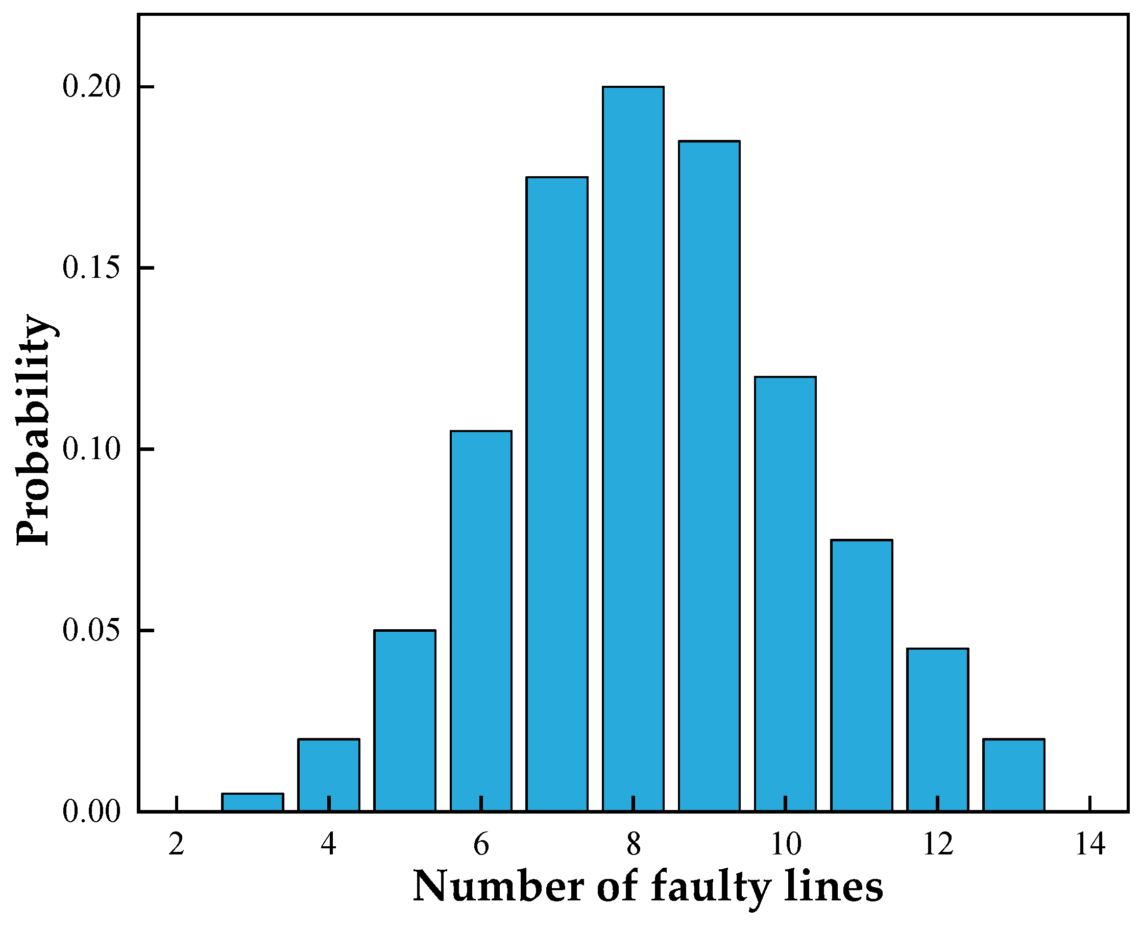 - Based on the proposed line fault rate model considering the thermal effect of current, the evolution process of distribution line faults over time under extreme ice and snow conditions is accurately depicted. Furthermore, the information entropy-based typical scenario screening method is utilized to screen for typical fault scenarios, which improves the accuracy of identifying fault locations in the distribution network.