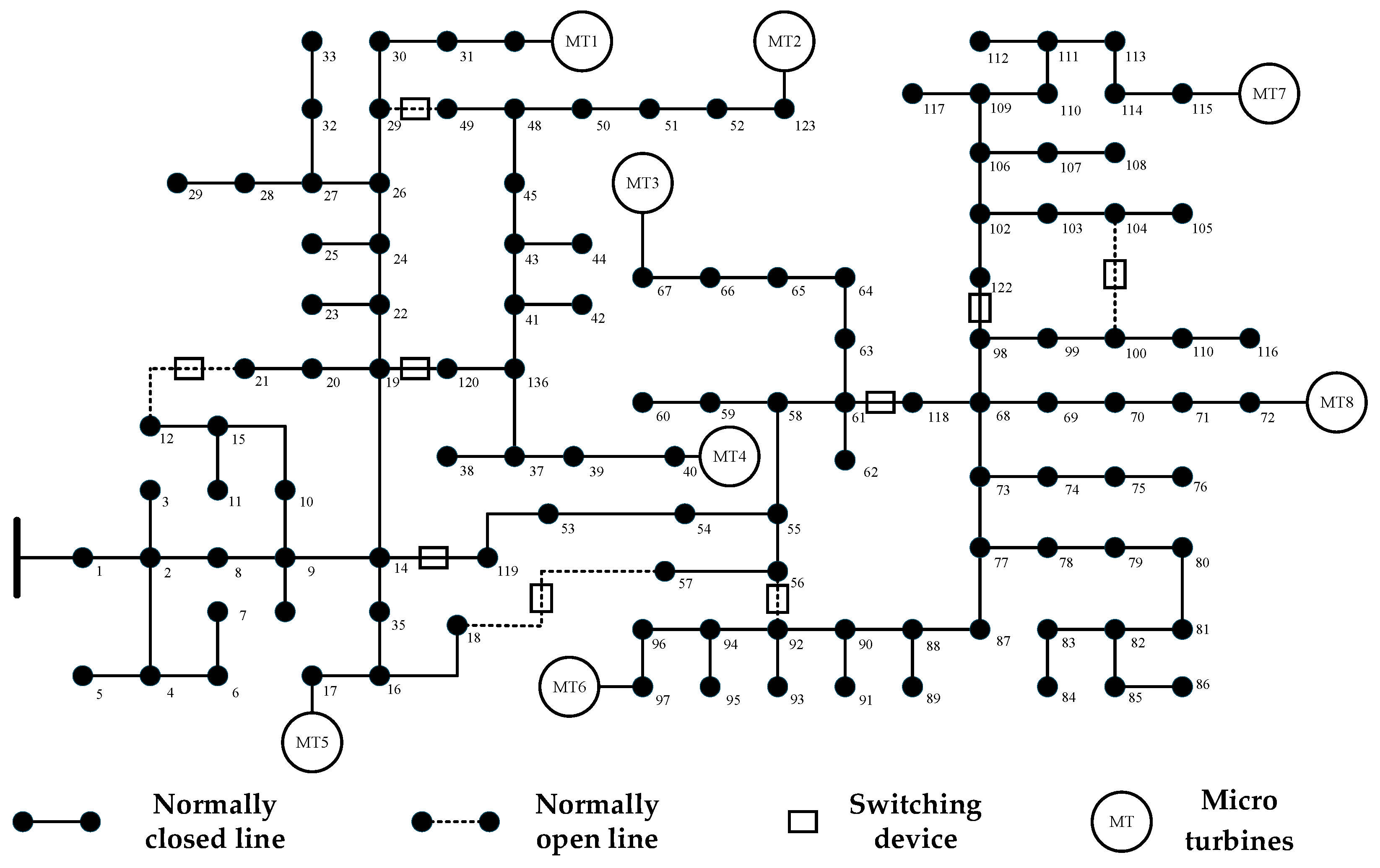 - He, Y.; Li, Y.; Liu, J.; Xiang, X.; Sheng, F.; Zhu, X.; Fang, Y.; Wu, Z. A two-stage fault reconfiguration strategy for distribution networks with high penetration of distributed generators. Electronics 2025, 14, 1872. [Google Scholar] [CrossRef]