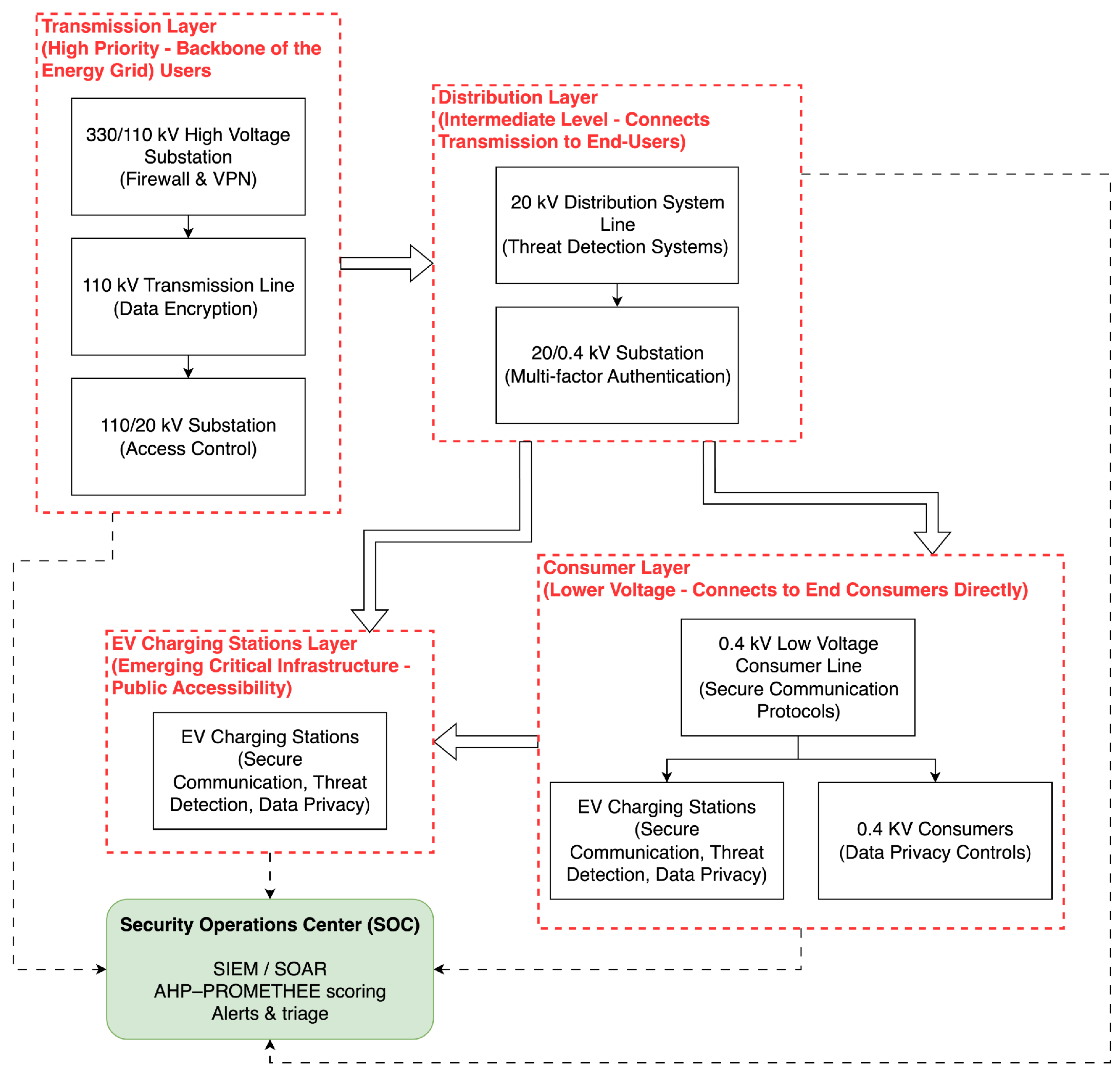 Figure 1 illustrates the four-level segmentation into the layers of transmission, distribution, consumer and EV-charging stations and highlights typical cybersecurity controls across different voltage levels and functional zones of EV infrastructure. Each layer operates under distinct physical and digital control environments, with varying exposure to cyber–physical threats and different operational dependencies. Moreover, the layered architecture introduces unique cybersecurity demands based on its function, exposure, and digital maturity. This segmentation provides the basis for the subsequent quantitative risk evaluation using a hybrid AHP–PROMETHEE methodology, ensuring that prioritization reflects the operational context of cyber threats.