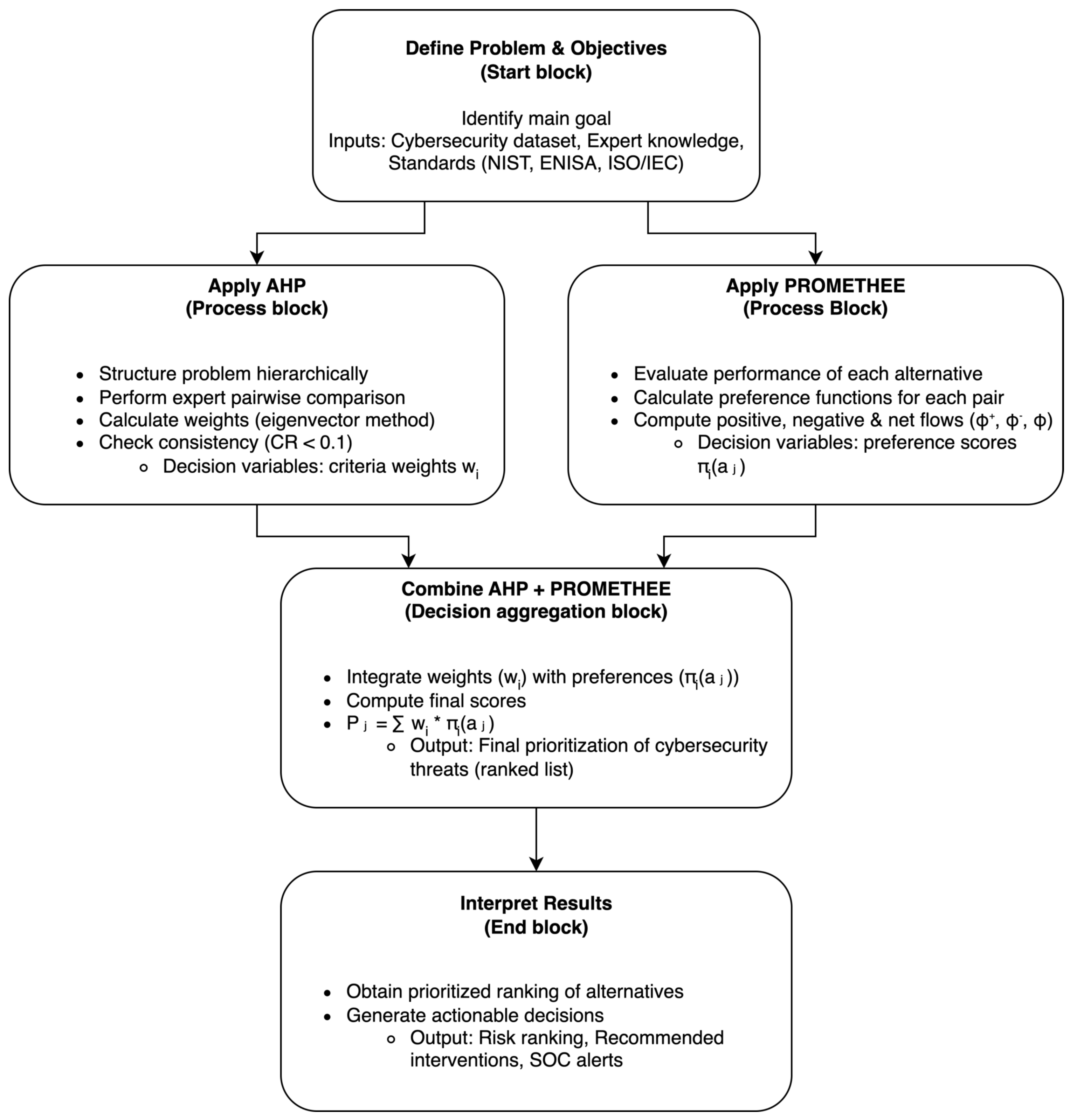 AHP guarantees traceability and consistency of criteria weighting, whereas PROMETHEE excels at computing preference flows without a rigid hierarchical structure. By combining these two, a hybrid AHP–PROMETHEE approach can synergistically exploit expert knowledge and data-driven evaluation to yield a comprehensive cybersecurity risk assessment.