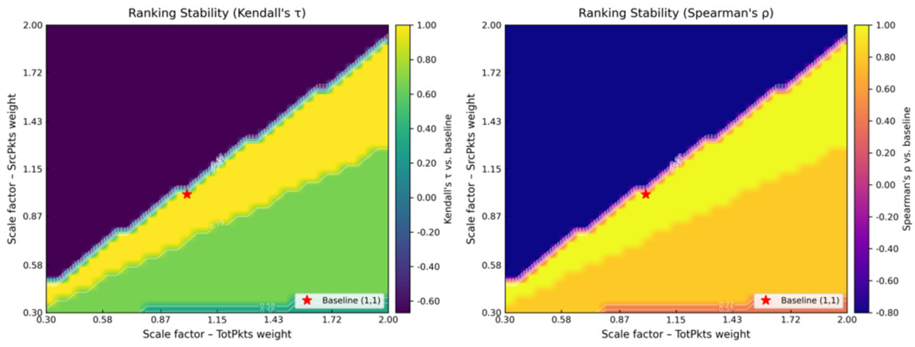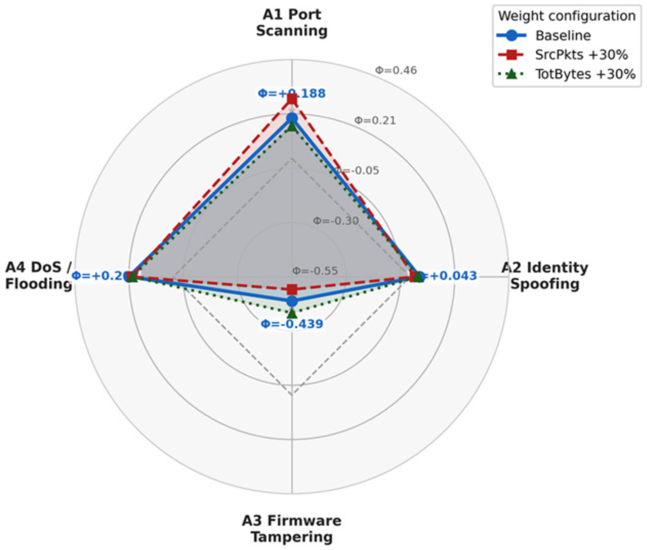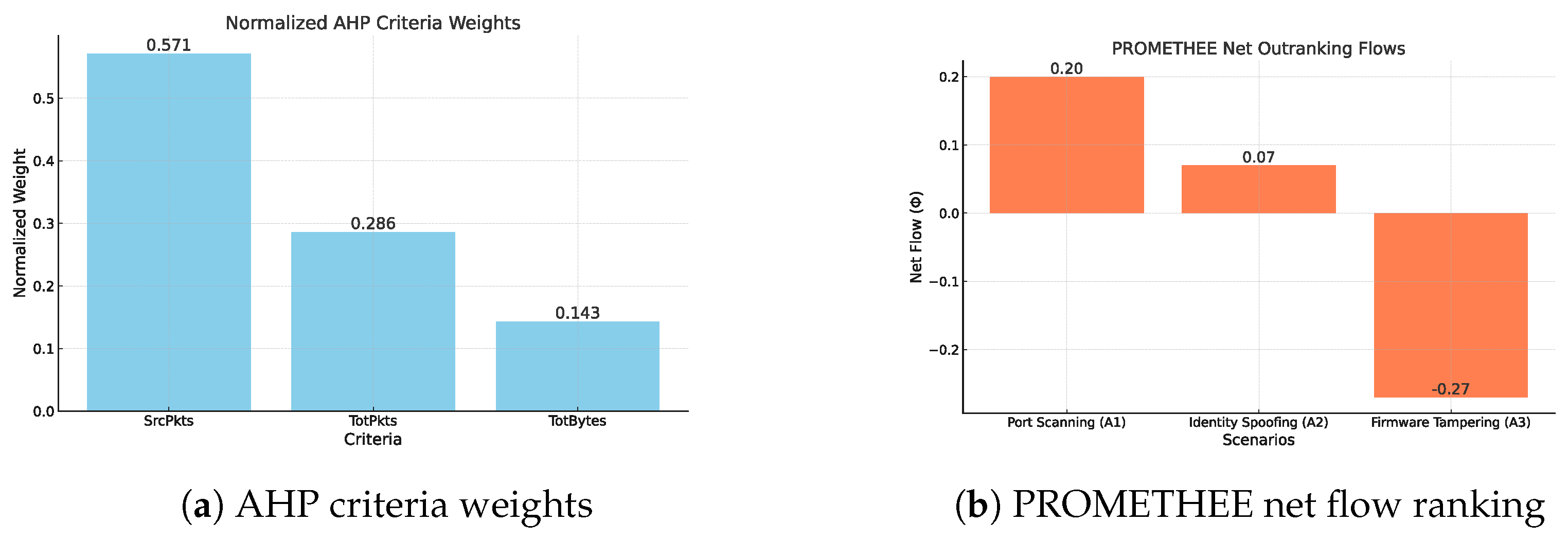 The model also provides clear threat prioritization. Reconnaissance activities such as port and device scanning consistently received the highest PROMETHEE net-flow scores, largely due to anomalies in source packet counts (SrcPkts). Exploitation traffic ranked slightly lower, reflecting the smaller AHP weights assigned to data volume metrics like total bytes (TotBytes). This alignment between expert-defined weights and observed traffic behavior reinforces confidence in the model’s outputs.