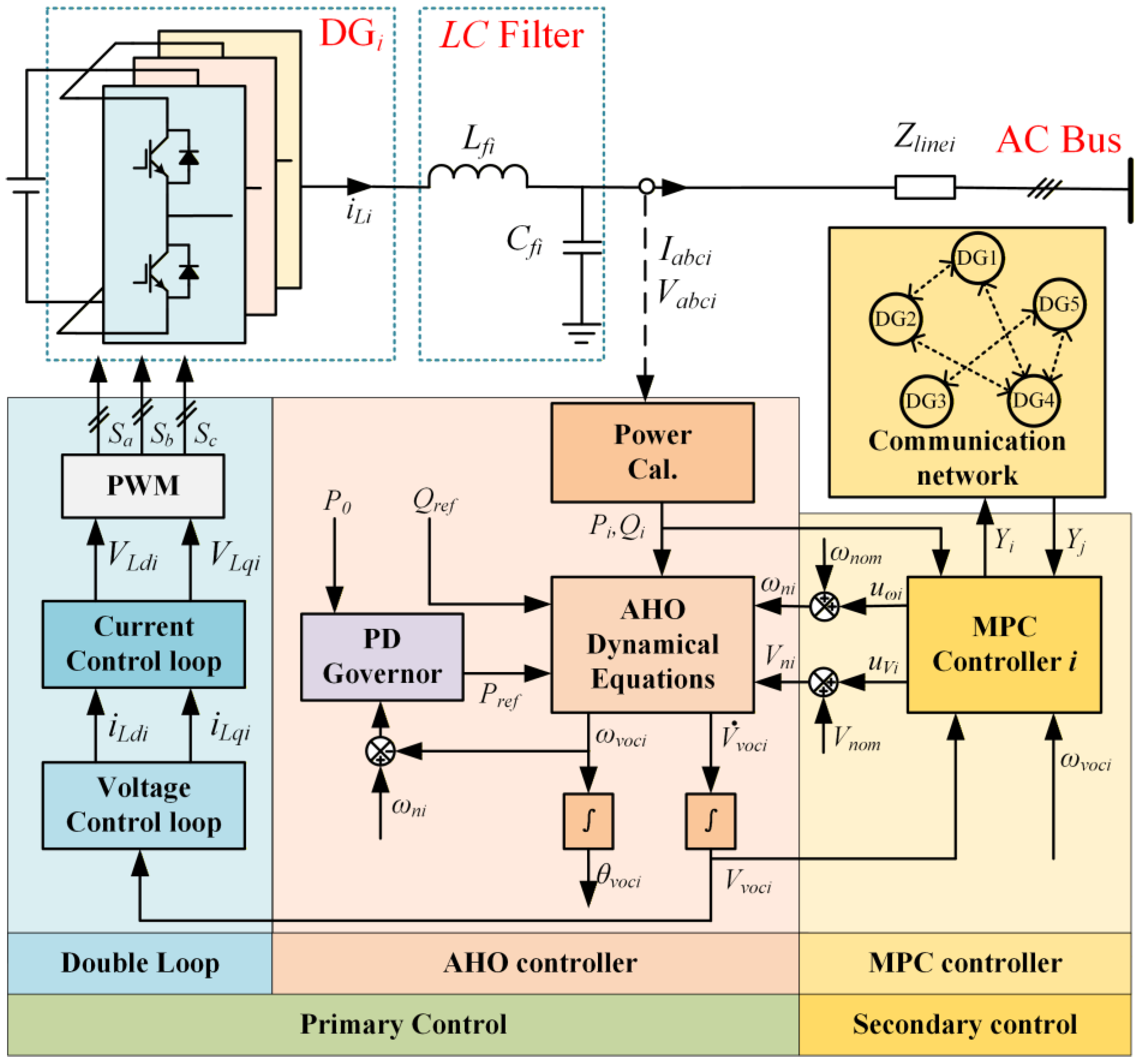 In microgrids, the frequency and voltage stability of DGs are usually guaranteed by local primary controllers, while the distributed secondary controller is to eliminate deviations induced by the primary control. In this paper, the Andronov–Hopf (AHO) dVOC control strategy is used in the primary controllers for each DG, in which a voltage reference signal capable of autonomous regulation is constructed by directly integrating the power reference commands into the nonlinear dynamic model, thereby facilitating precise control over the inverter output power. The distributed MPC method is adopted for each secondary controller; the prediction sequence of neighbor nodes, Yj, is requisite. Additionally, it facilitates information exchange with other MPC controllers via communication nodes.