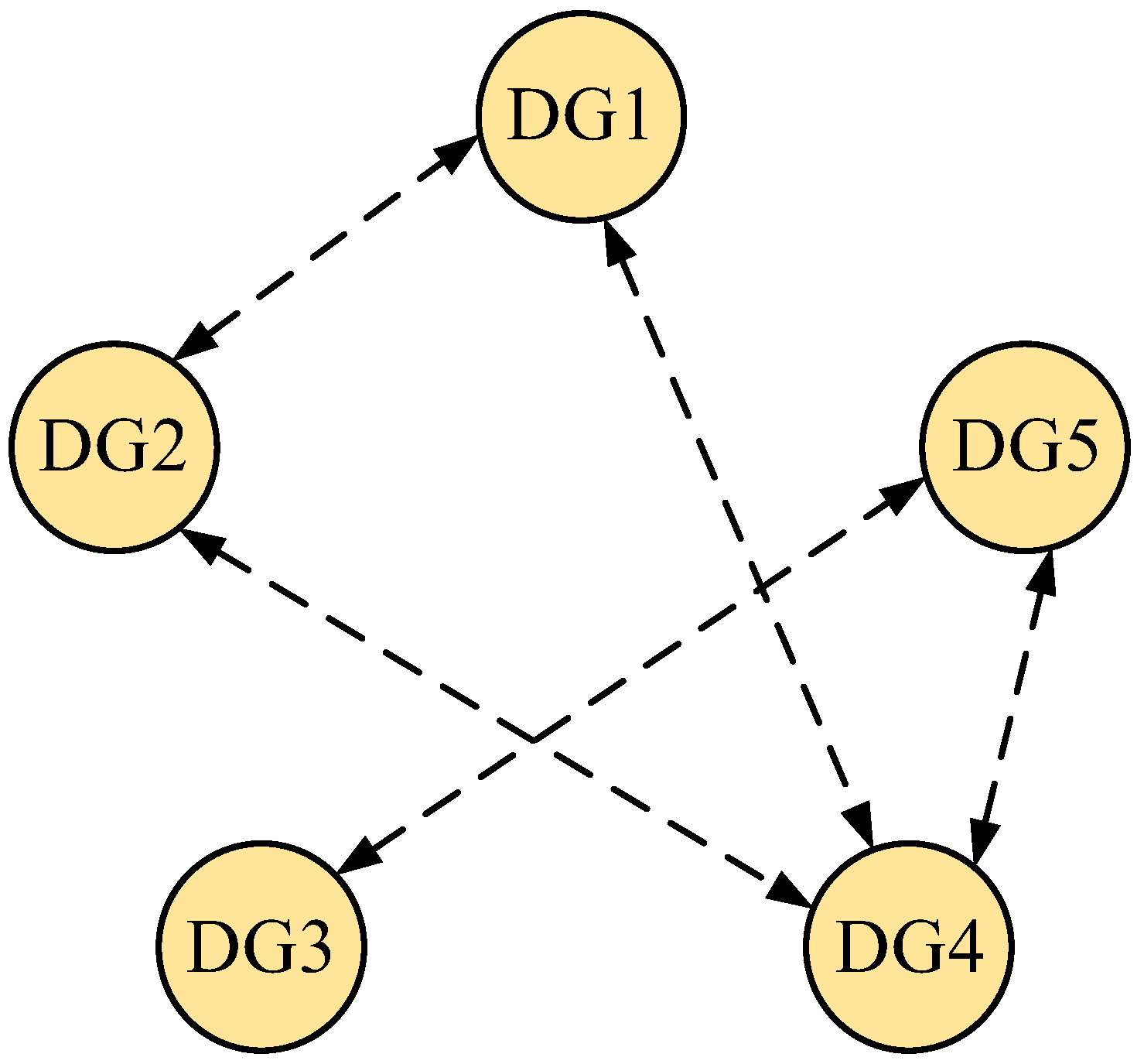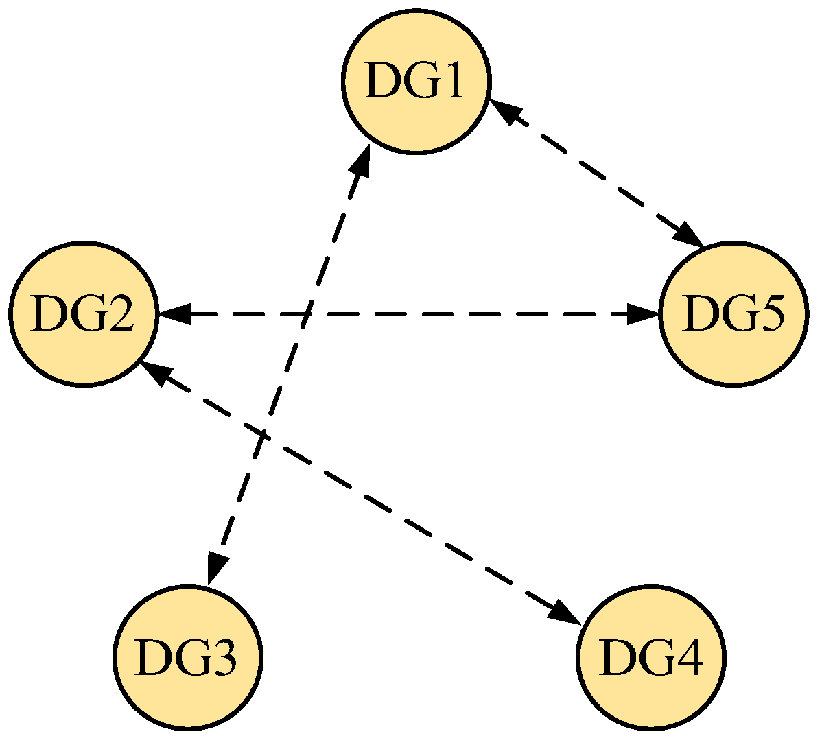 To verify the effectiveness, robustness, and superiority of the proposed DMPC secondary control strategy in the dVOC-based microgrids, a simulation model comprising five DGs, as shown in