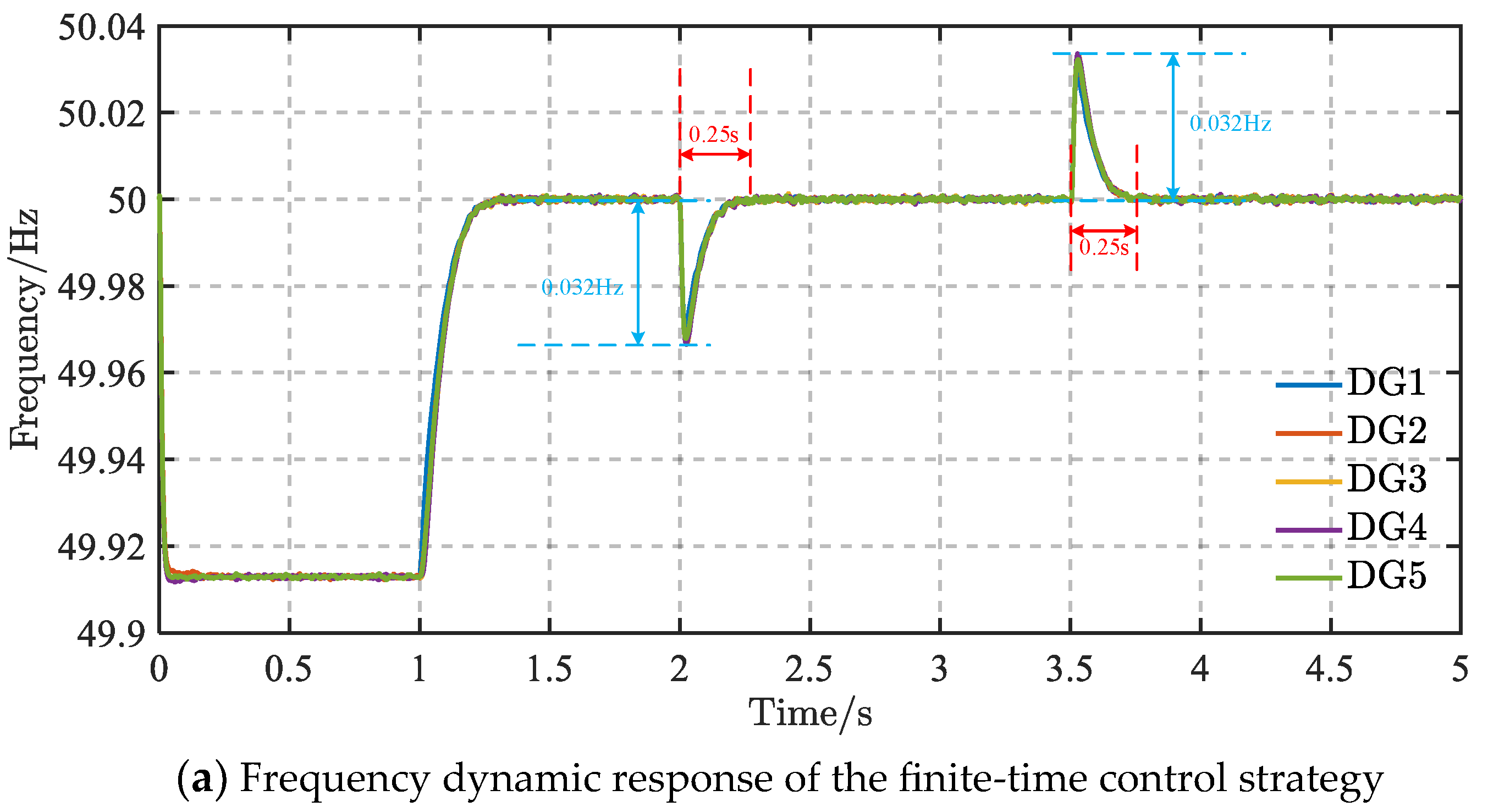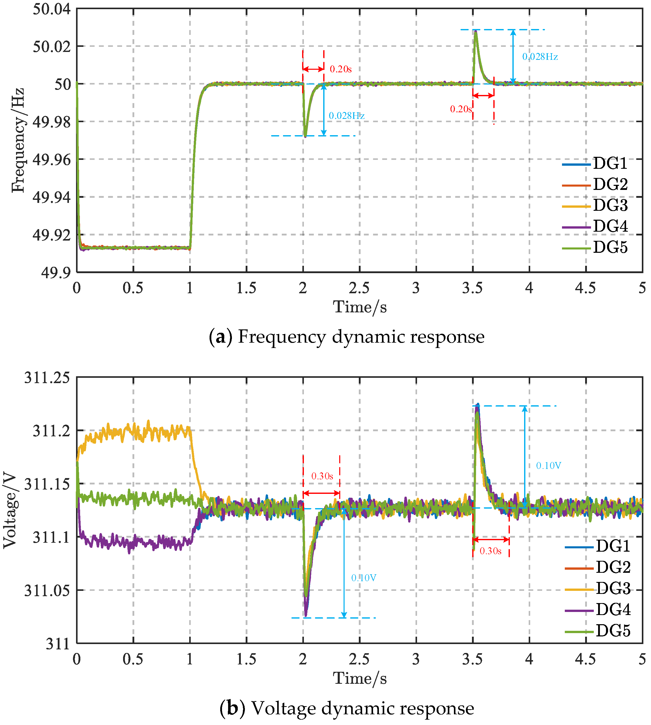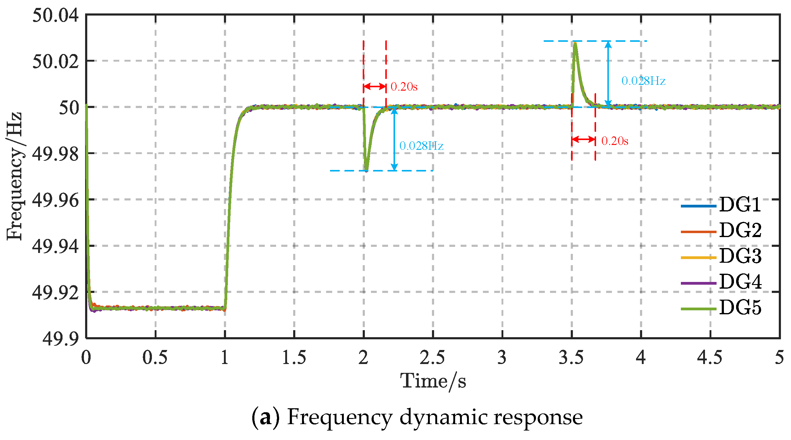 Figure 4a, the maximum frequency deviation is 0.028 Hz at both load switching instants, and the corresponding settling time is about 0.20 s. As shown in