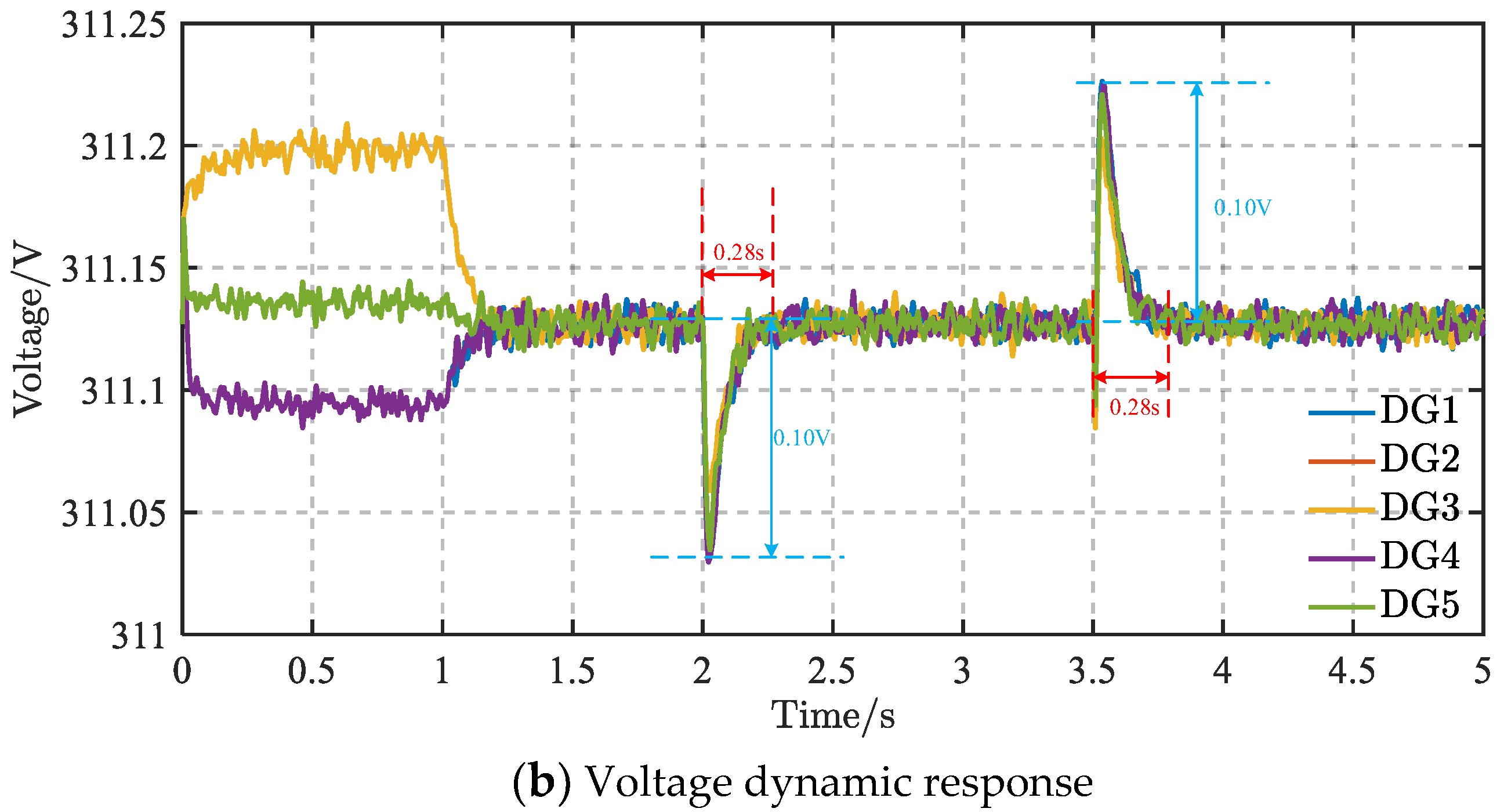 Figure 4b, the maximum voltage deviation is 0.10 V and the voltage settling time is about 0.30 s for both load connection and disconnection. No significant overshoot is observed throughout the process, which verified the effectiveness of the DMPC method under load change conditions.