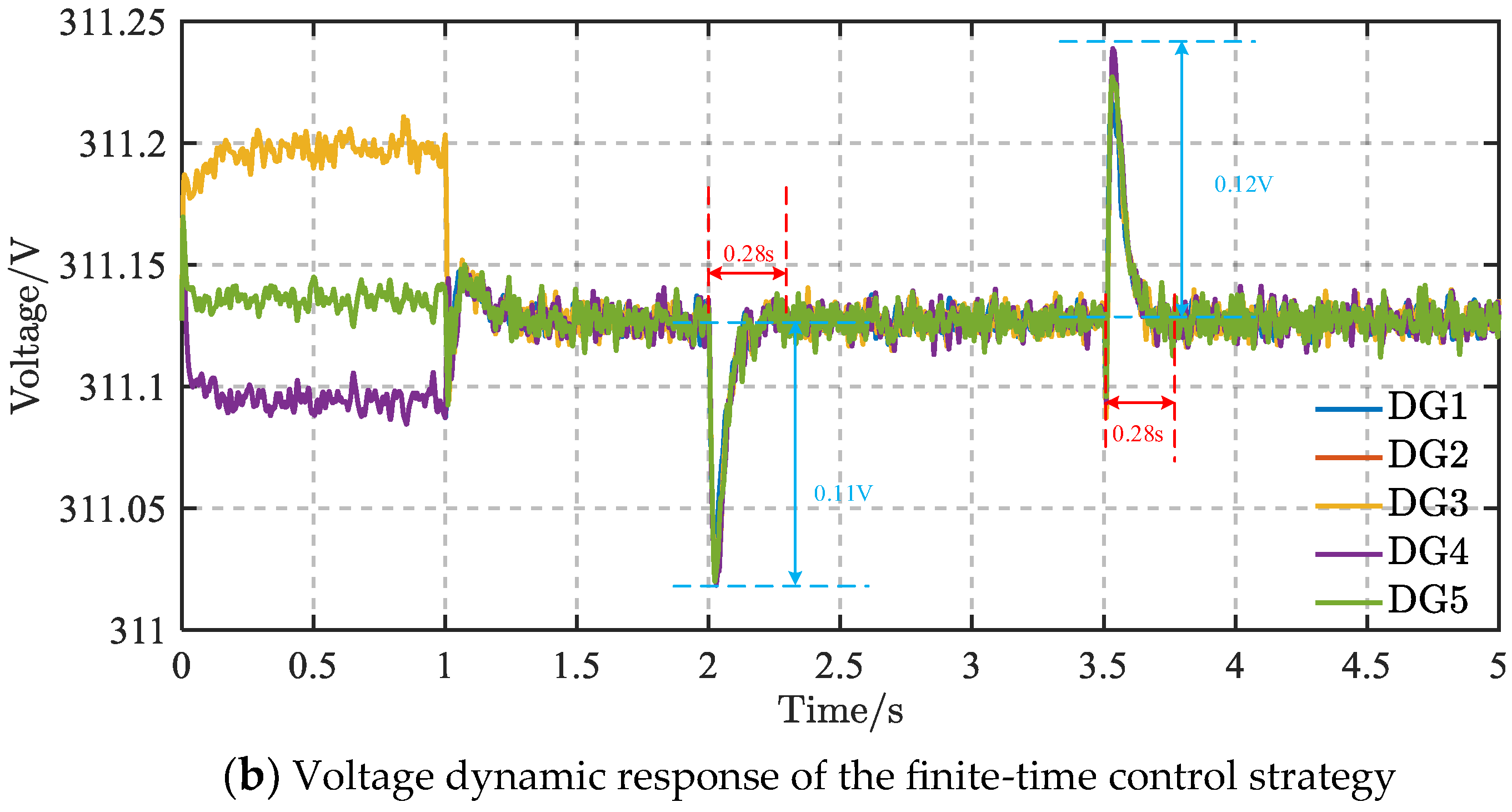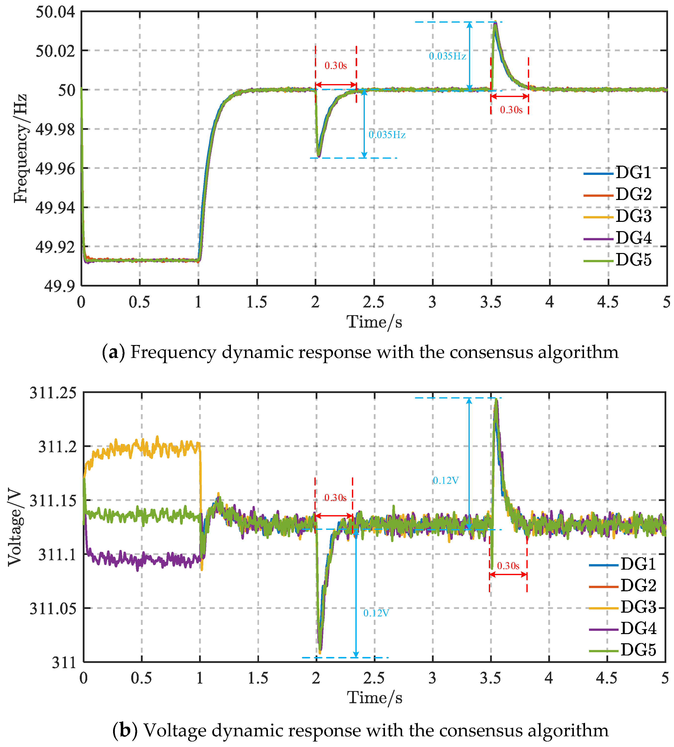 Figure 7 illustrates the dynamic responses of frequency and voltage for the consensus algorithm and finite-time control, respectively.